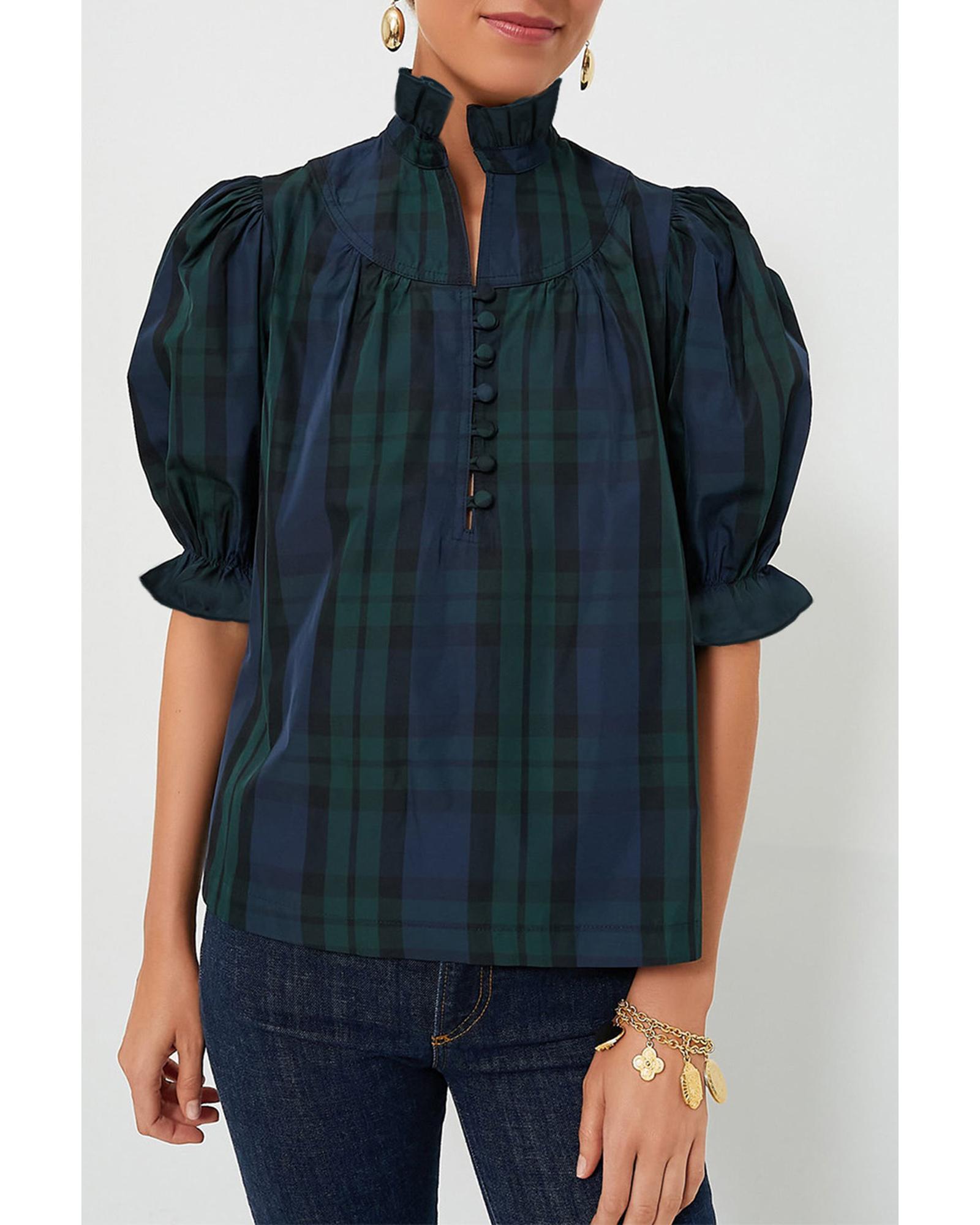 - Green Stripe Plaid Puff Sleeve Frilled Trim Elegant Blouse