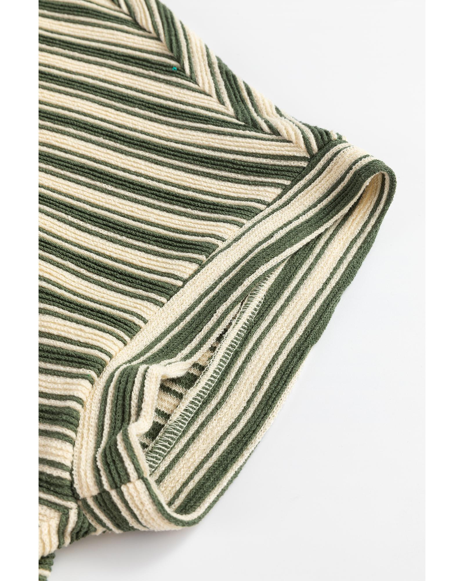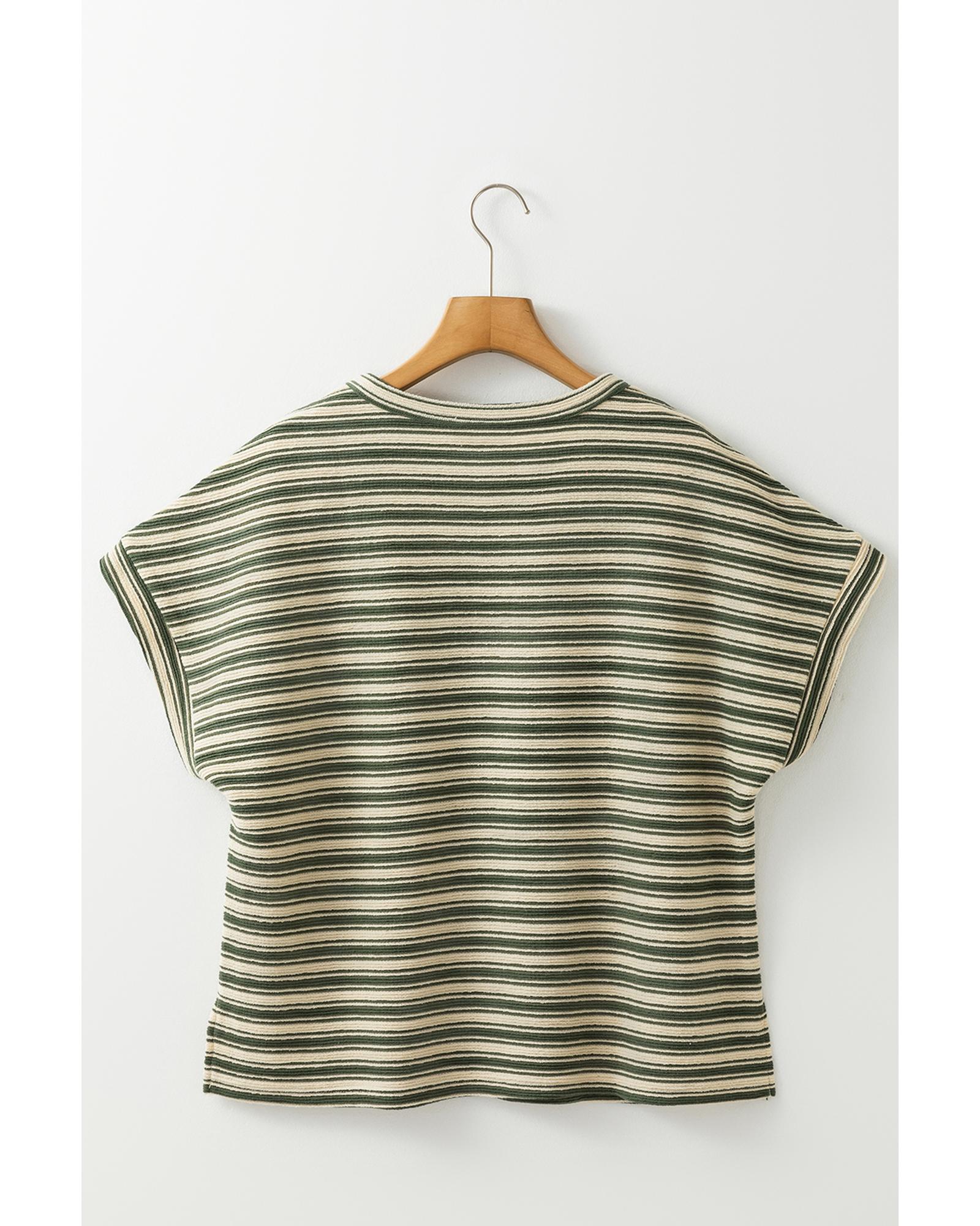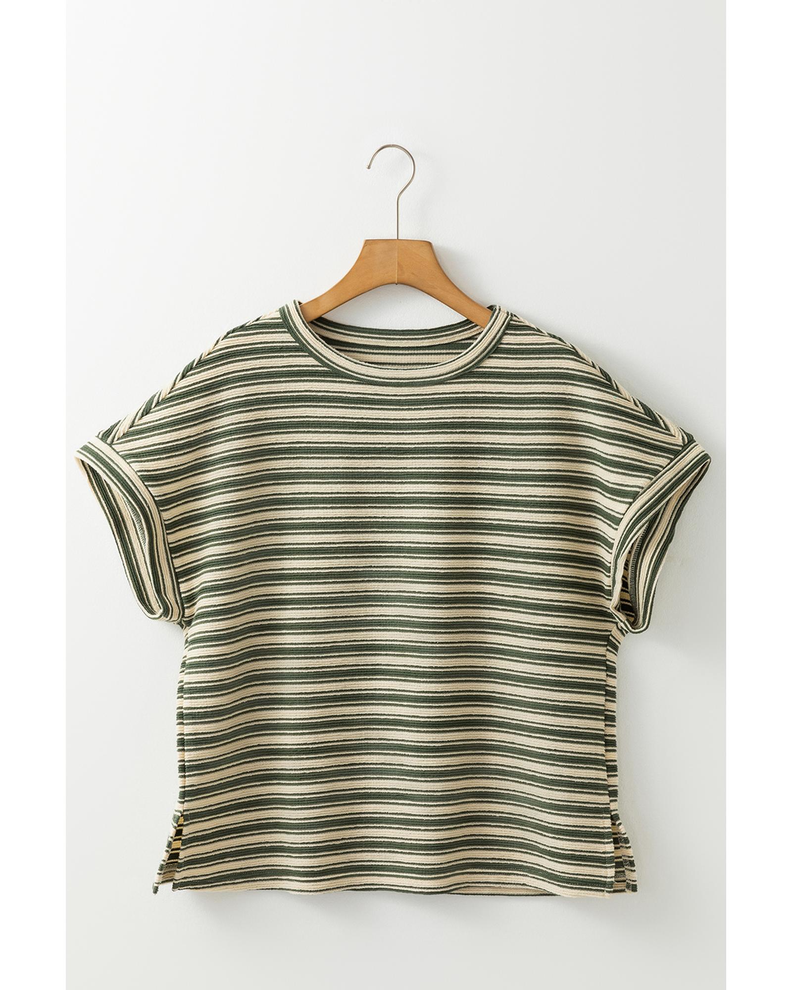 Green Stripe Textured Side Slits Crew Neck T Shirt – L