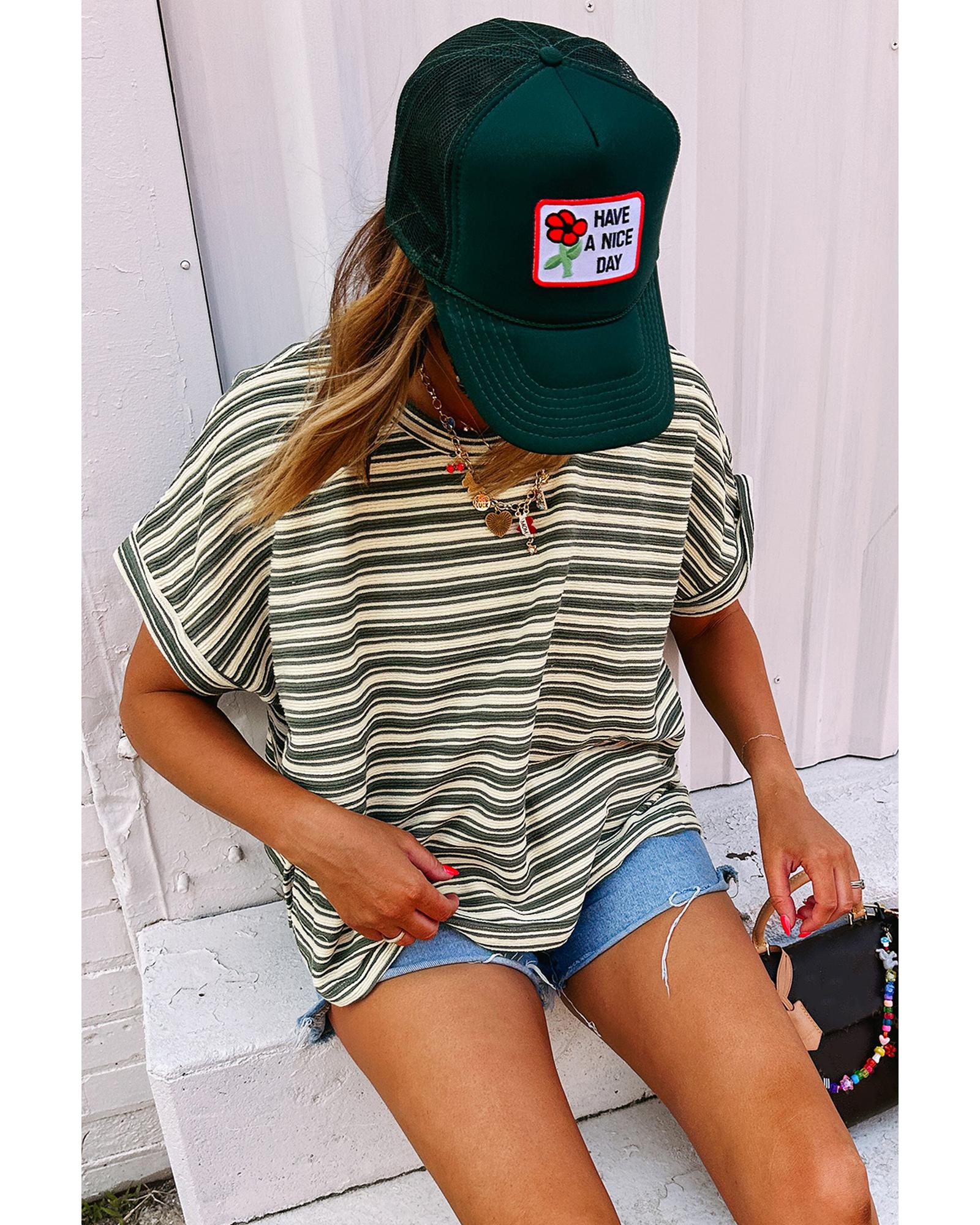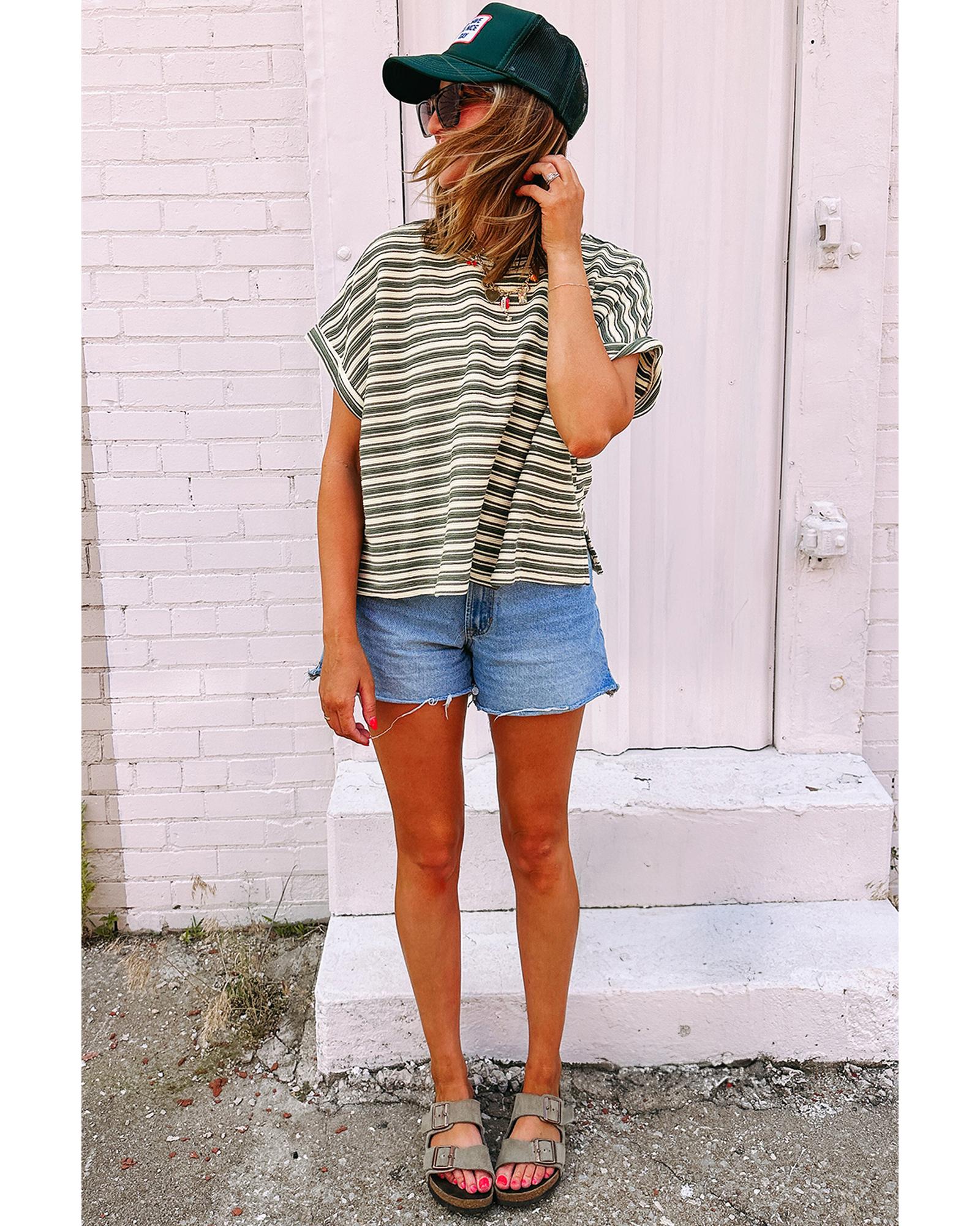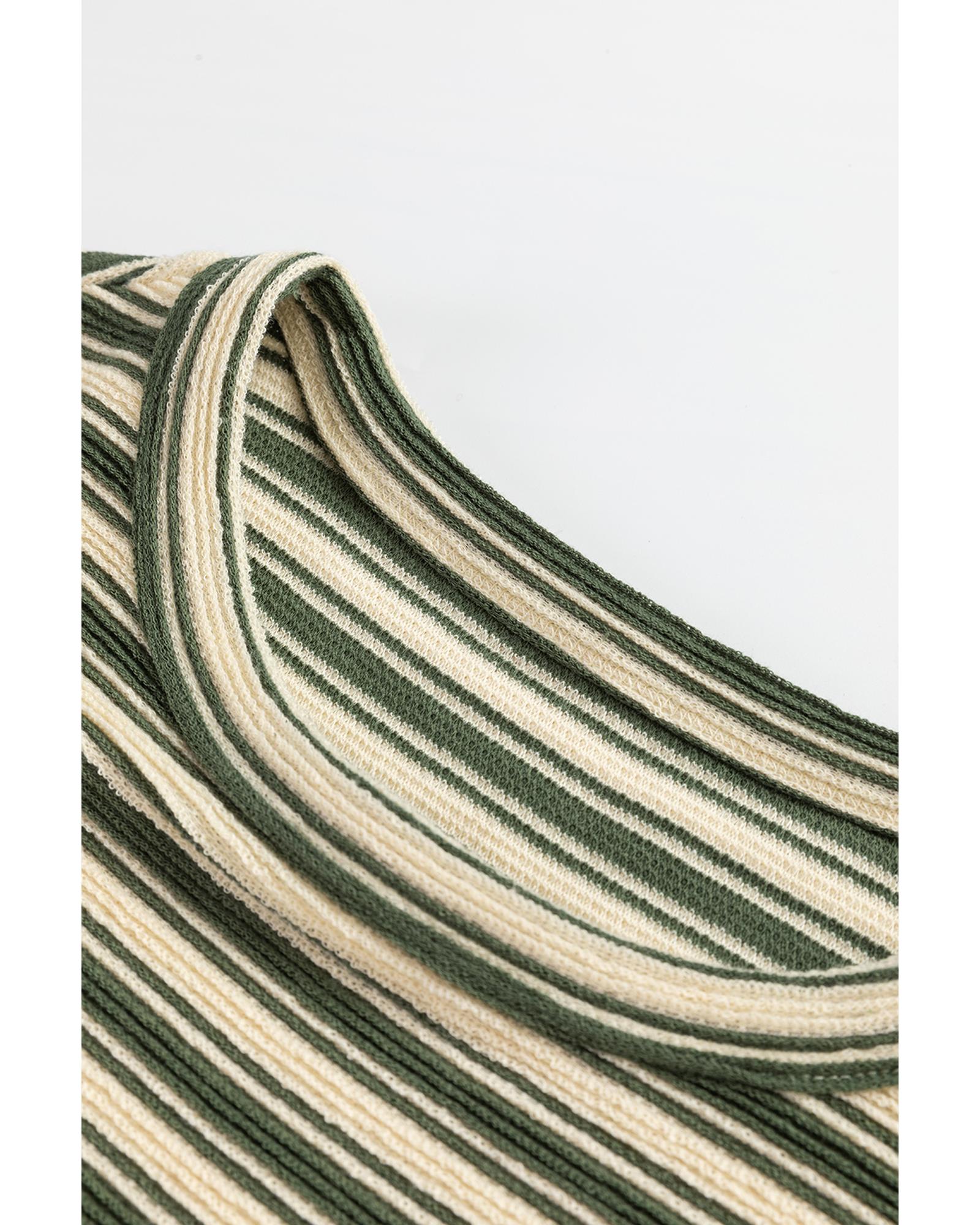 Green Stripe Textured Side Slits Crew Neck T Shirt – L