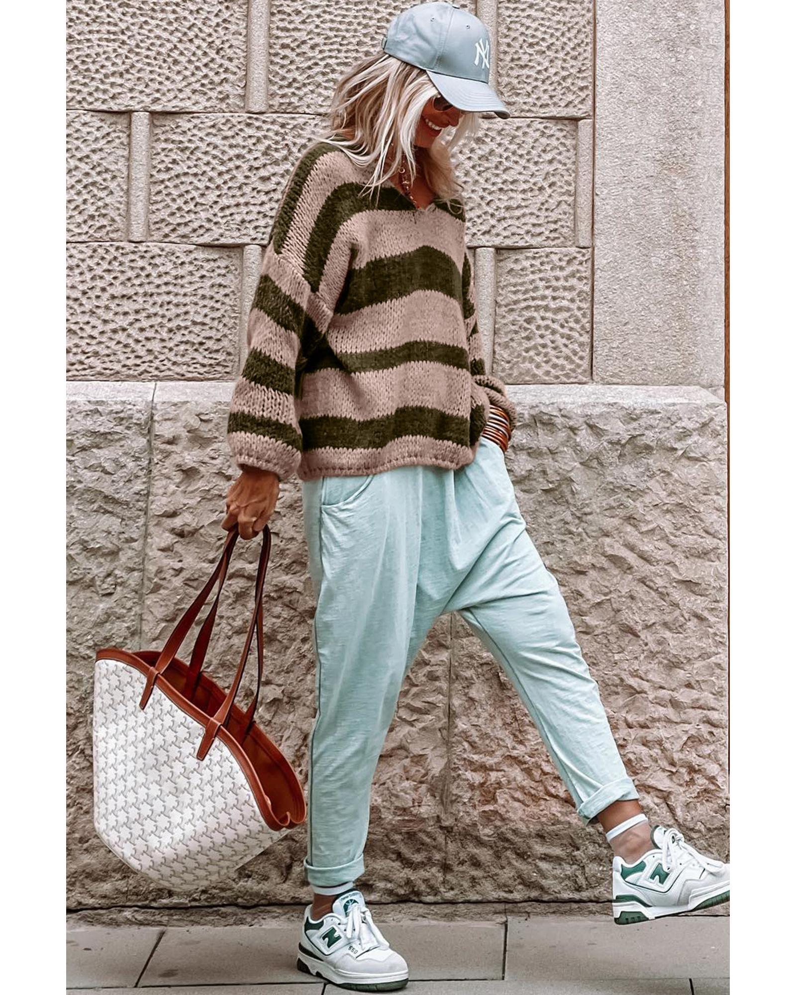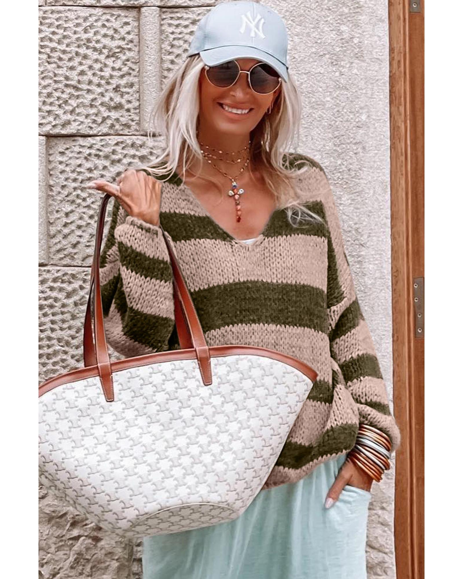 Green Striped Colorblock Knit V Neck Loose Fit Sweater – L