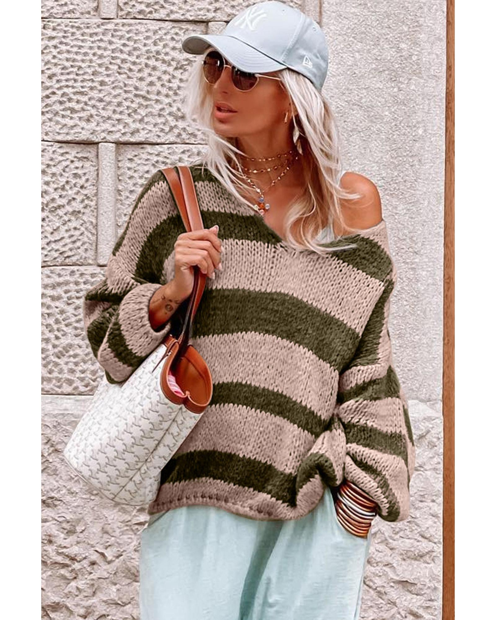 Green Striped Colorblock Knit V Neck Loose Fit Sweater – M