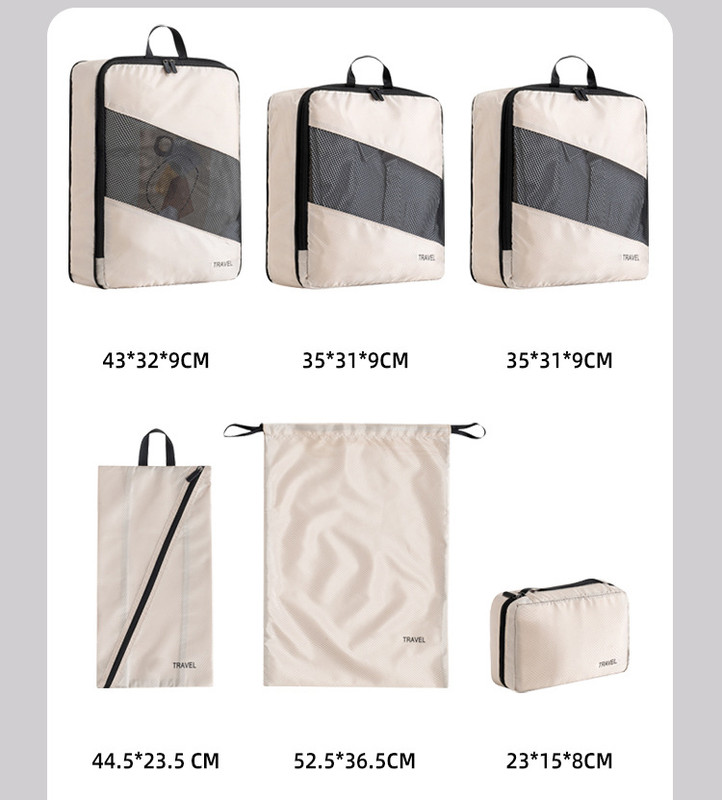 Streamline your packing and revolutionize the way you travel with our versatile 6-Piece Compression Packing Cube Set. Designed to keep your clothes, shoes, and toiletries impeccably organized and compressed, this set is an essential companion for any journey, helping you fit more into your suitcase while keeping everything neat and easy to find. Crafted from durable, lightweight polyester, these organizers are built for efficient travel.