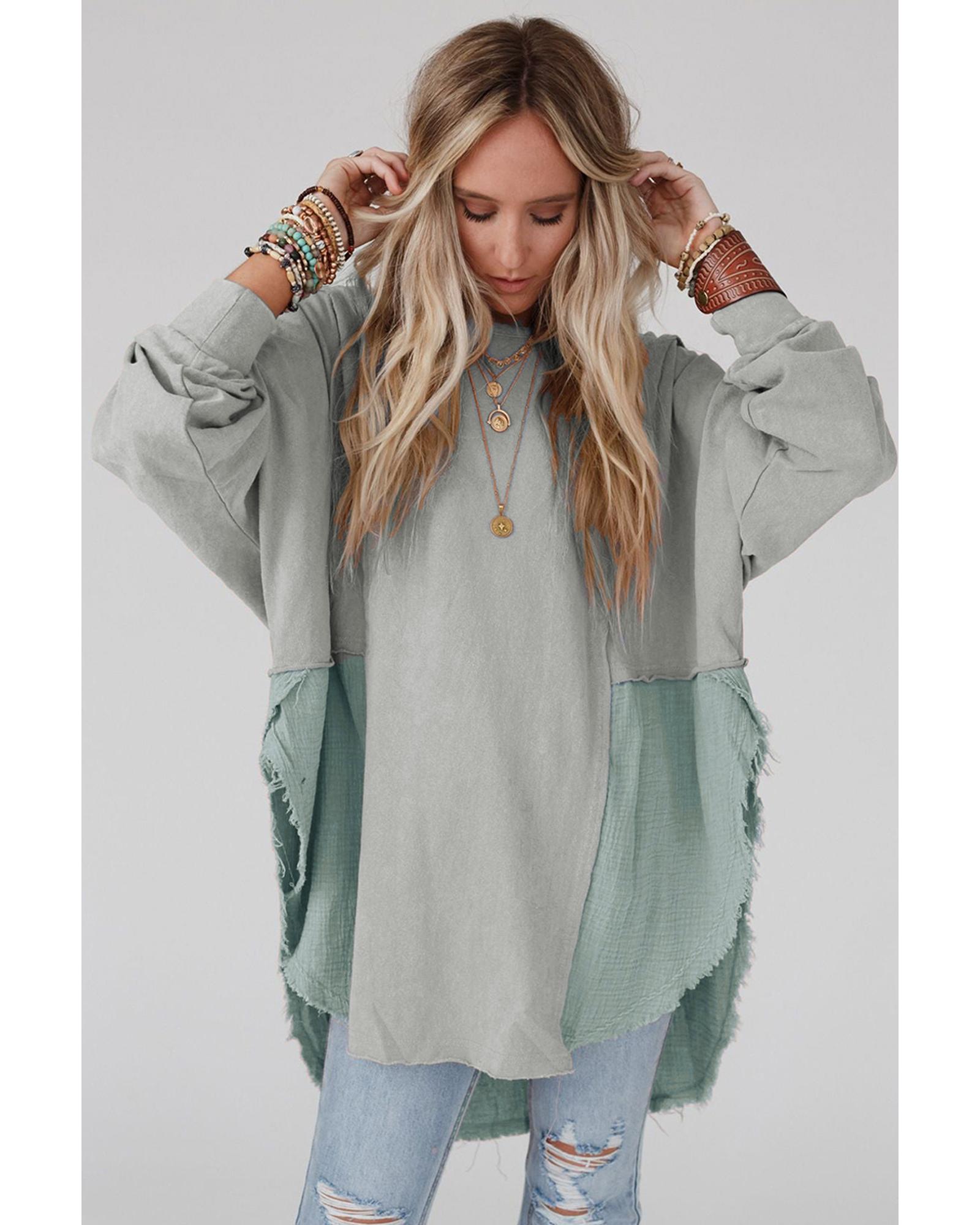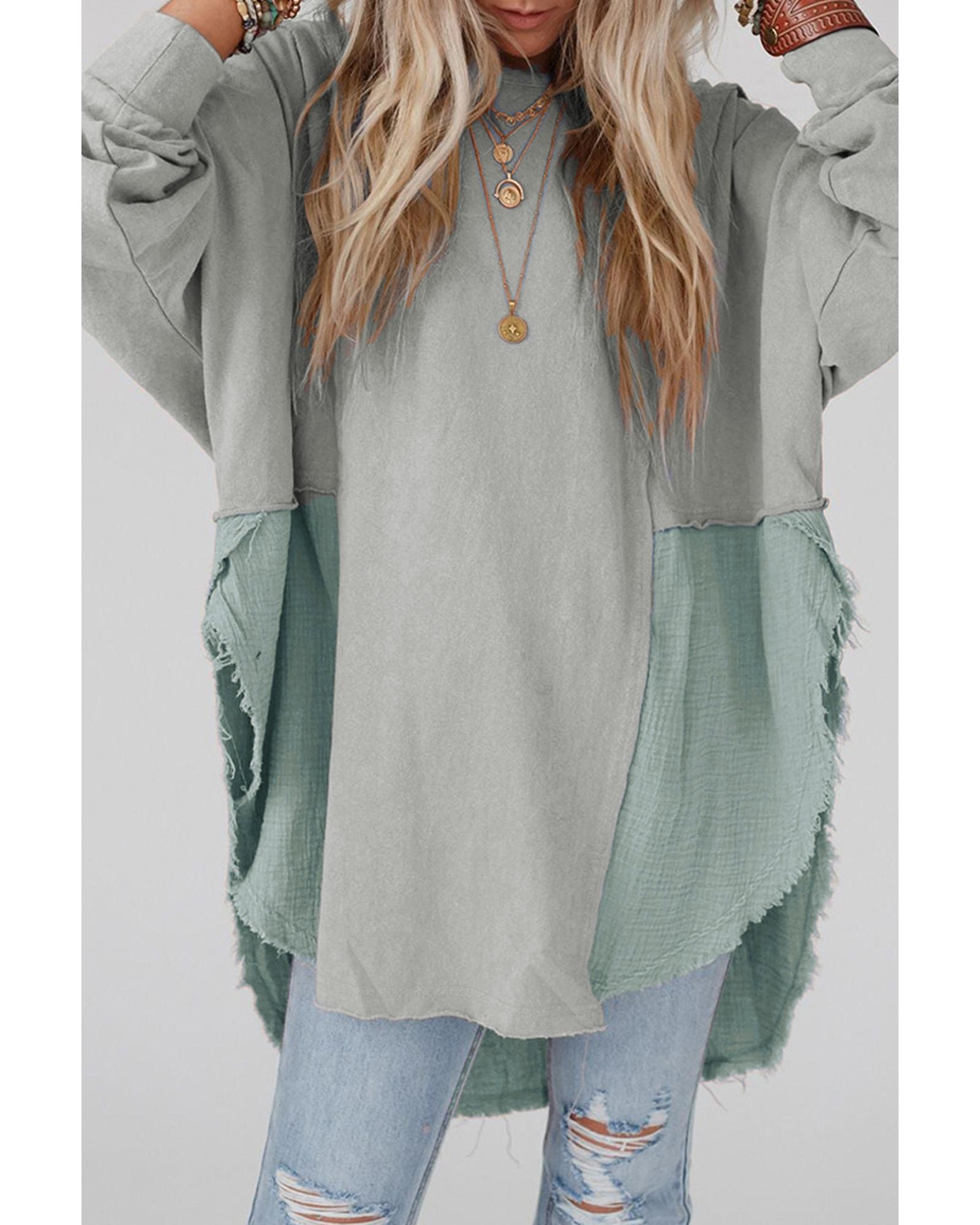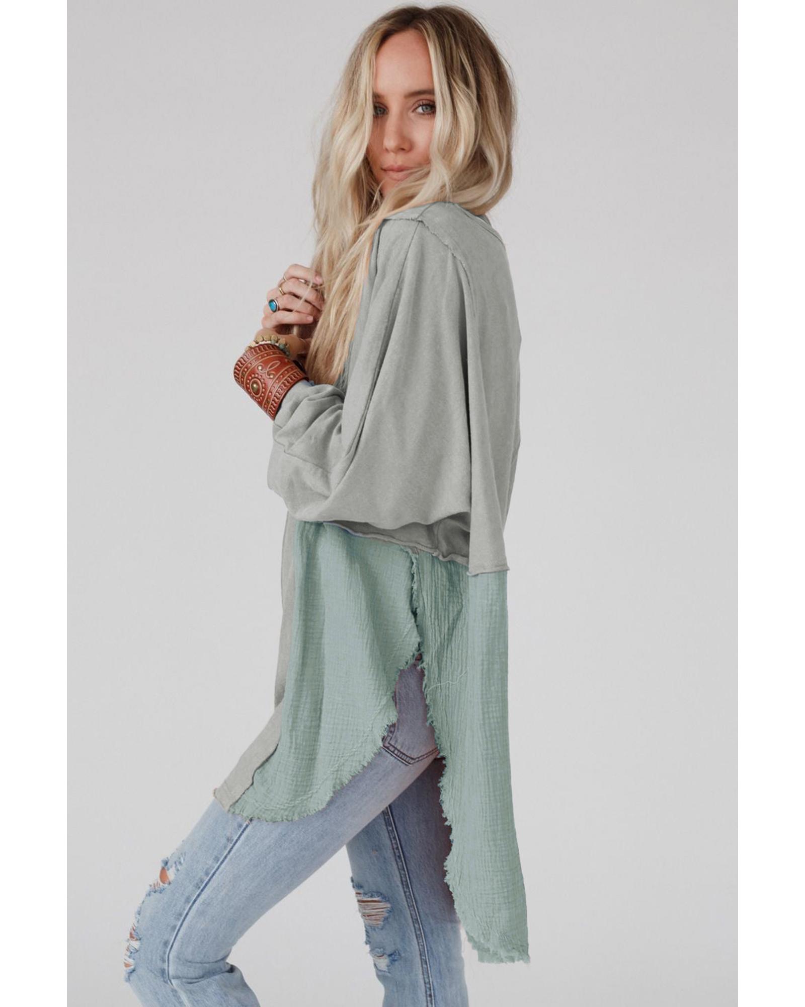 Grey Crinkle Splicing Raw Hem High Low Oversized Blouse – S