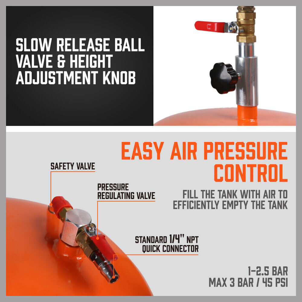 • Oil Drain Tank Working Pressure: Max 45psi. Air Inlet:Standard ¼ NPT. Ideal For Extracting Waste Oil and Other Fluids From Vehicles.