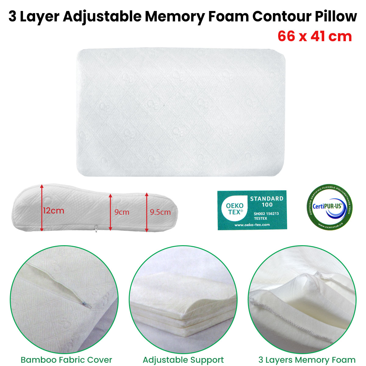 The Adjustable 3-Layer Memory Foam Contour Pillow 41x66cm by Hotel Living is designed for customizable comfort and superior support. It features a unique layered design that allows you to adjust its height and firmness to suit your sleeping style. It’s CertiPUR-US� and OEKO-TEX� certified, so you can rest easy knowing it’s safe and eco-conscious. This pillow adapts to you, offering a luxurious sleep experience every night. Net weight of pillow, 1.2kg. Pillow with packaging 1.8kg. Adjustable memory foam support with 3 layers of memory foam insert. In white and natural hues