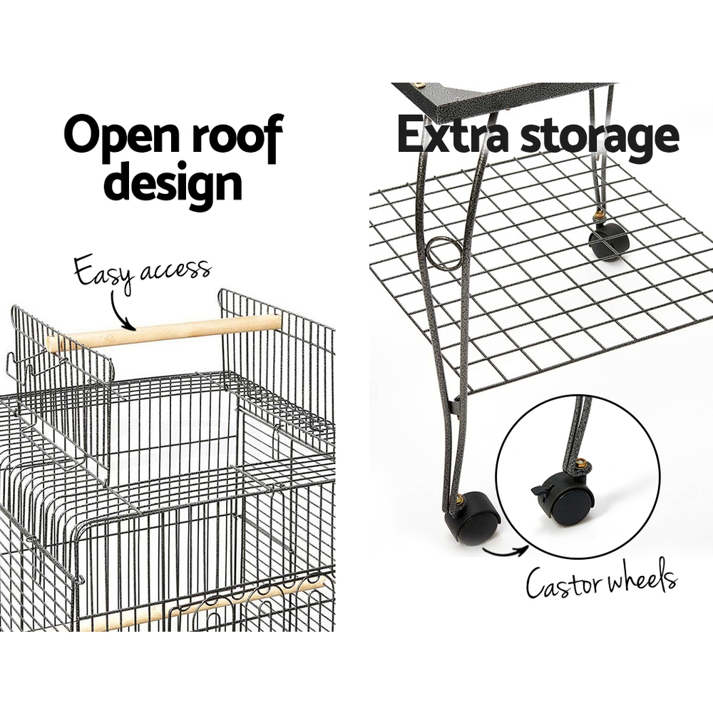 Made of sturdy, high quality and durable powder-coated wrought iron, the cage comes with a large access door, two small side access windows to swing in the stainless steel feeders, two timber perches and a removable tray for easy clean up. Better still, the roof can also be opened from the top.