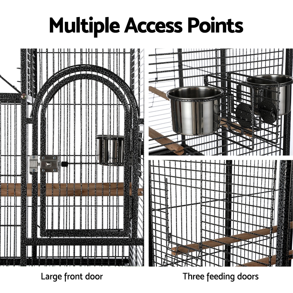 Explore the ultimate habitat for your feathered friends with this dynamic i.Pet bird cage. It seamlessly integrates playful elements like a climbing ladder and a toy hanger with practical features such as wooden perches and feeders. An undershelf provides additional storage space. The design emphasises ease of use, with a slide-out cleaning tray and a removable base for simple maintenance. Multiple doors offer effortless access to the cage, and the inclusion of smooth-rolling castor wheels ensures convenient mobility. Crafted with attention to detail, this cage is a haven of comfort and fun for your birds.
