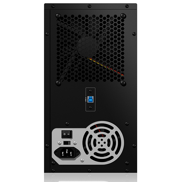 The enclosure is made mostly of steel and is therefore robust and dissipates heat particularly well. The cooling of the drives in heavy operation is furthermore guaranteed by a large 140 mm fan on the back.