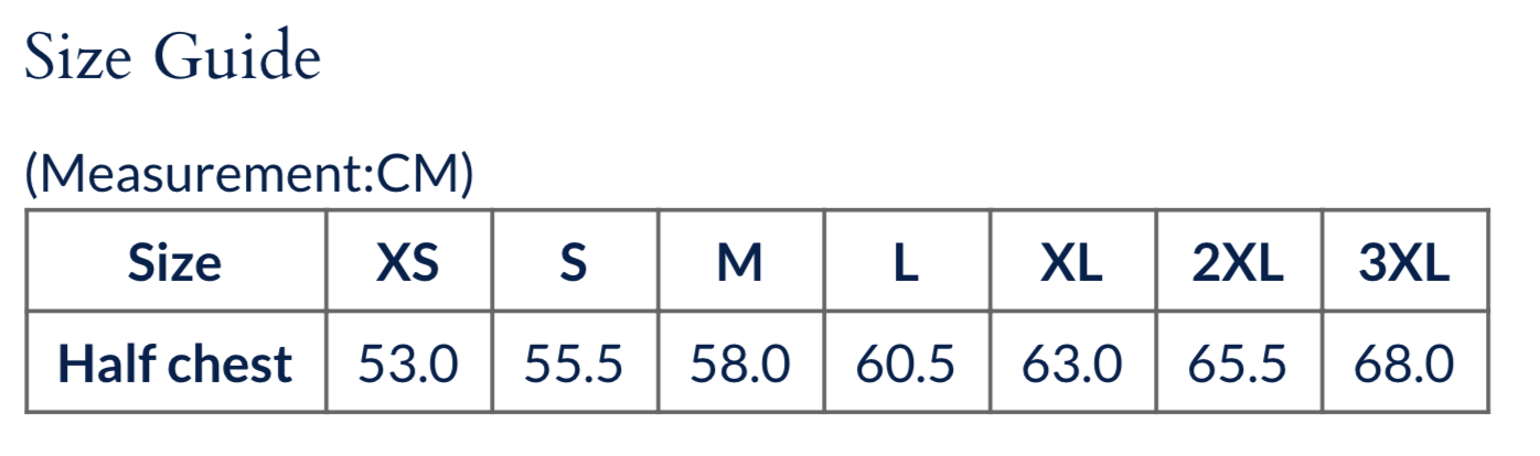 | Size | XS | S | M | L | XL | 2XL | 3XL |