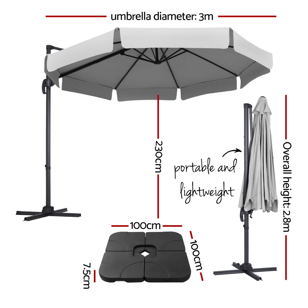 Instahut 3m Outdoor Umbrella w/Base Cantilever Beach Roma 360 Degree Tilt Grey