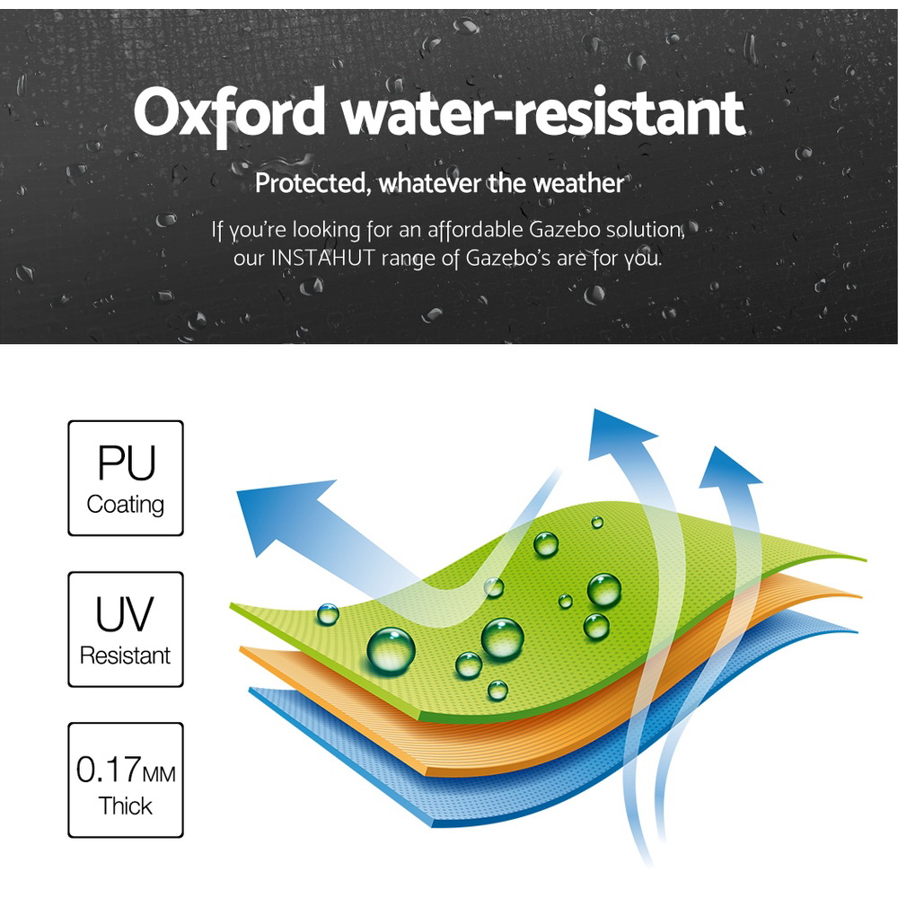 With a wide roof coverage of 300cm by 600cm, the exceptional 6kg cover is made of durable PU coating Oxford fabric thats both UV and water resistant. No more worries about being too hot or too wet, you can get your event going with total peace of mind from the elements. Giving you ample dry cover from rain and adequate protection from UV radiation.
