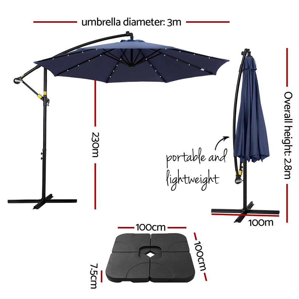 Instahut Outdoor Umbrella 3M Cantilever Beach LED w/Base Garden Shade Patio Navy