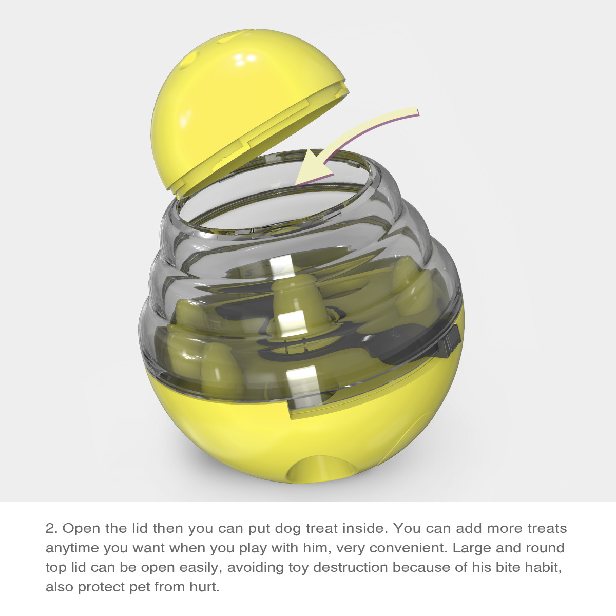 - Open top lid and fill with treats/food