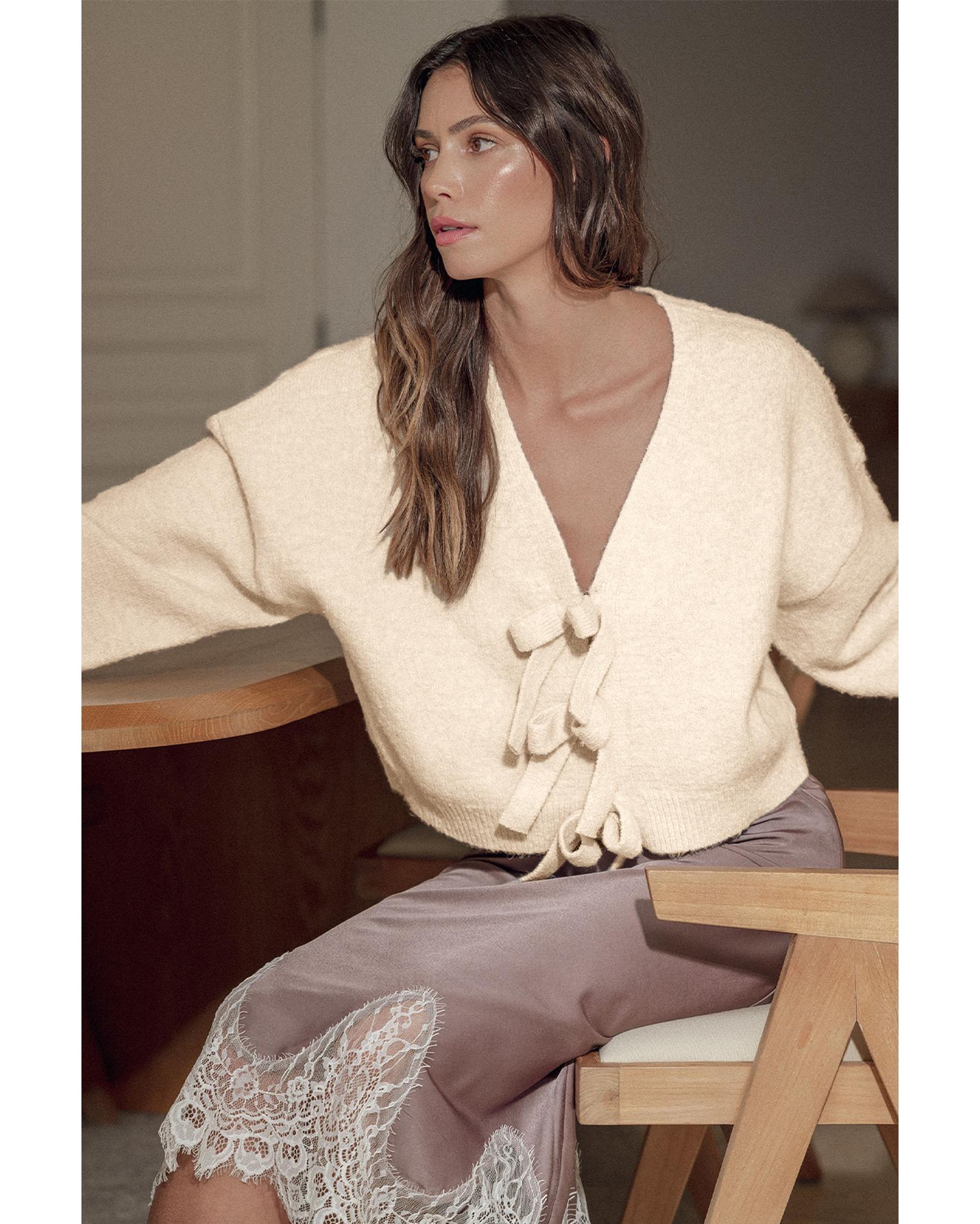 Jet Stream Bowknot Front Loose V Neck Knitted Cardigan – XL