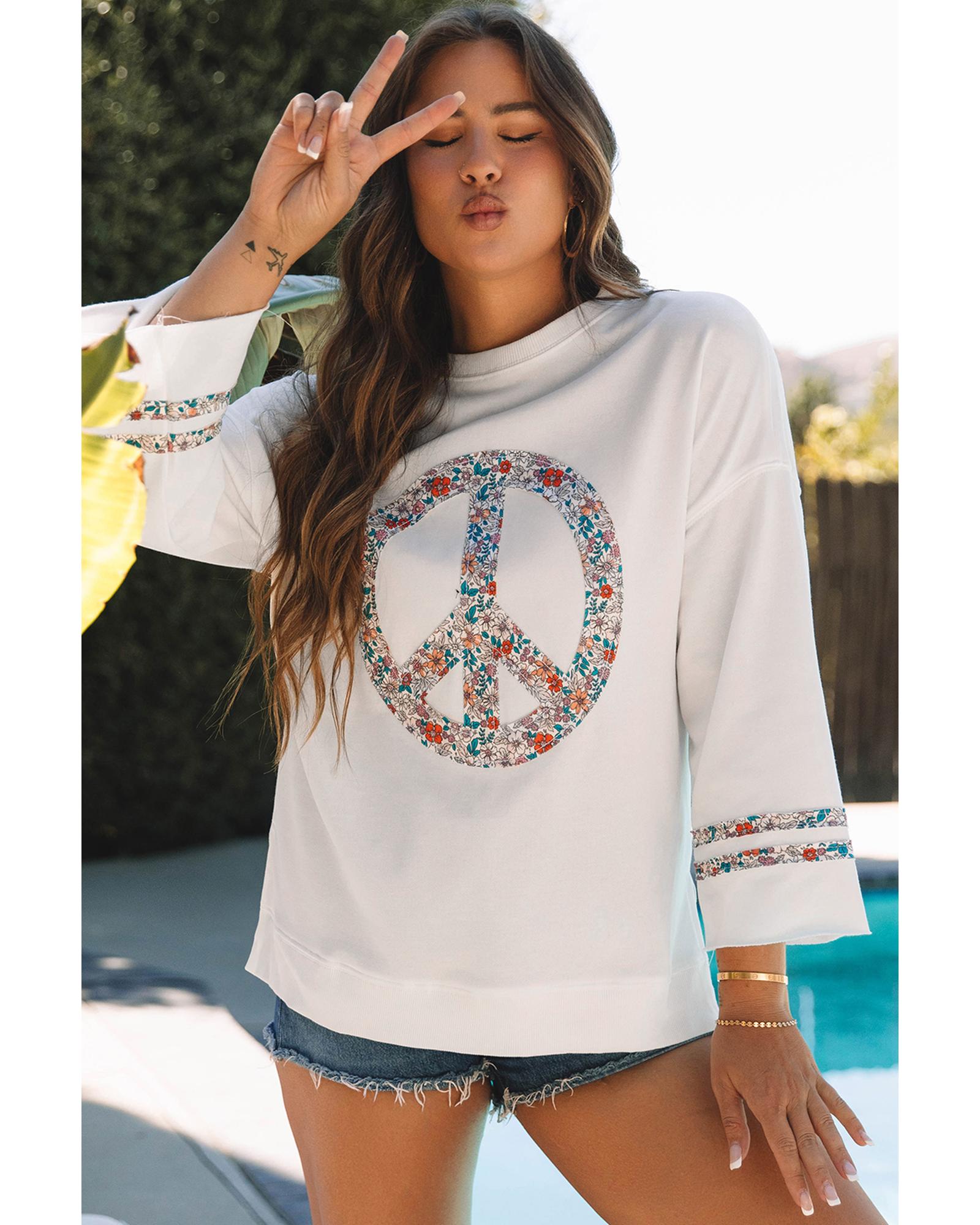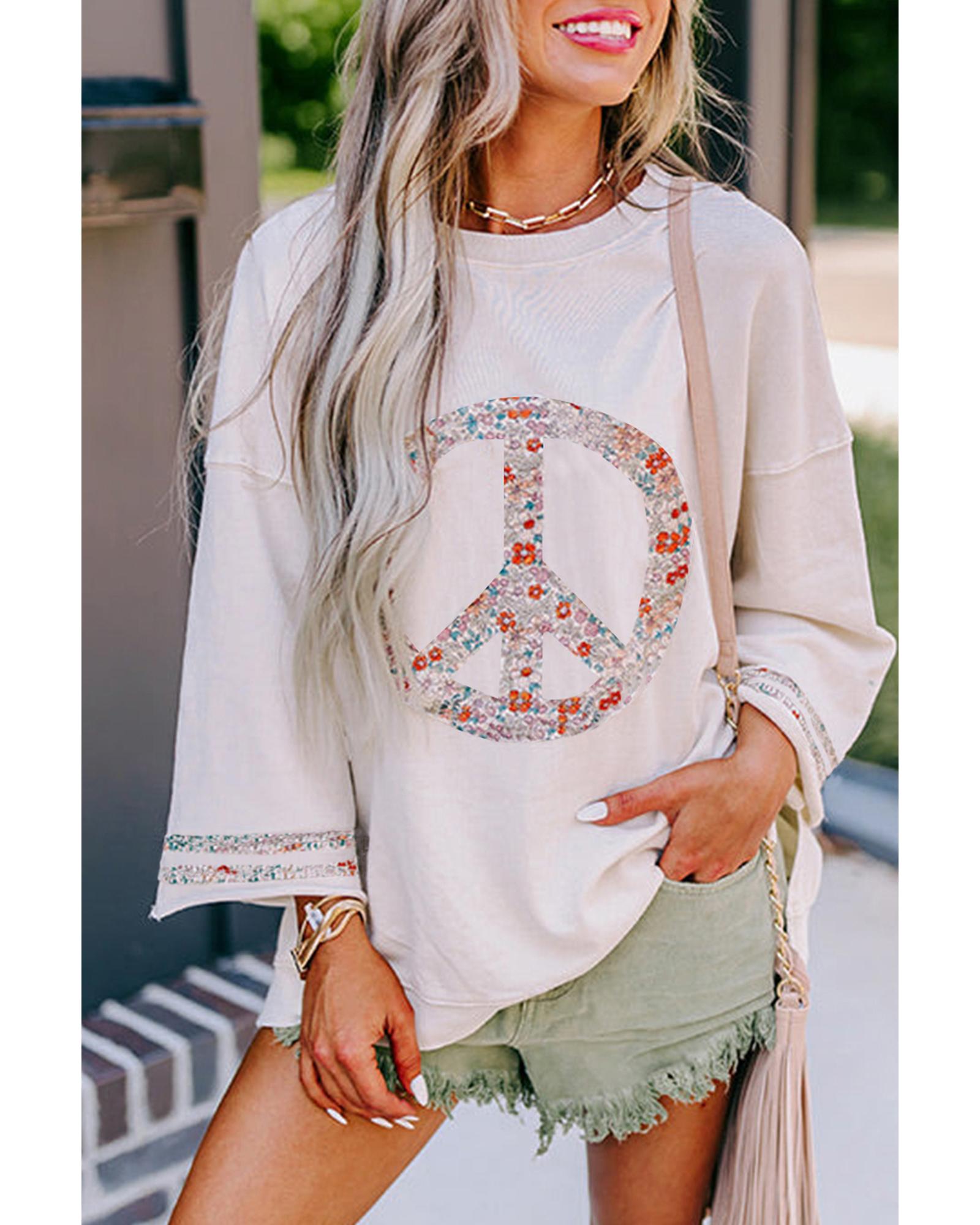 Jet Stream Floral Peace Sign Graphic Drop Shoulder Wide Sleeve Casual Top – L