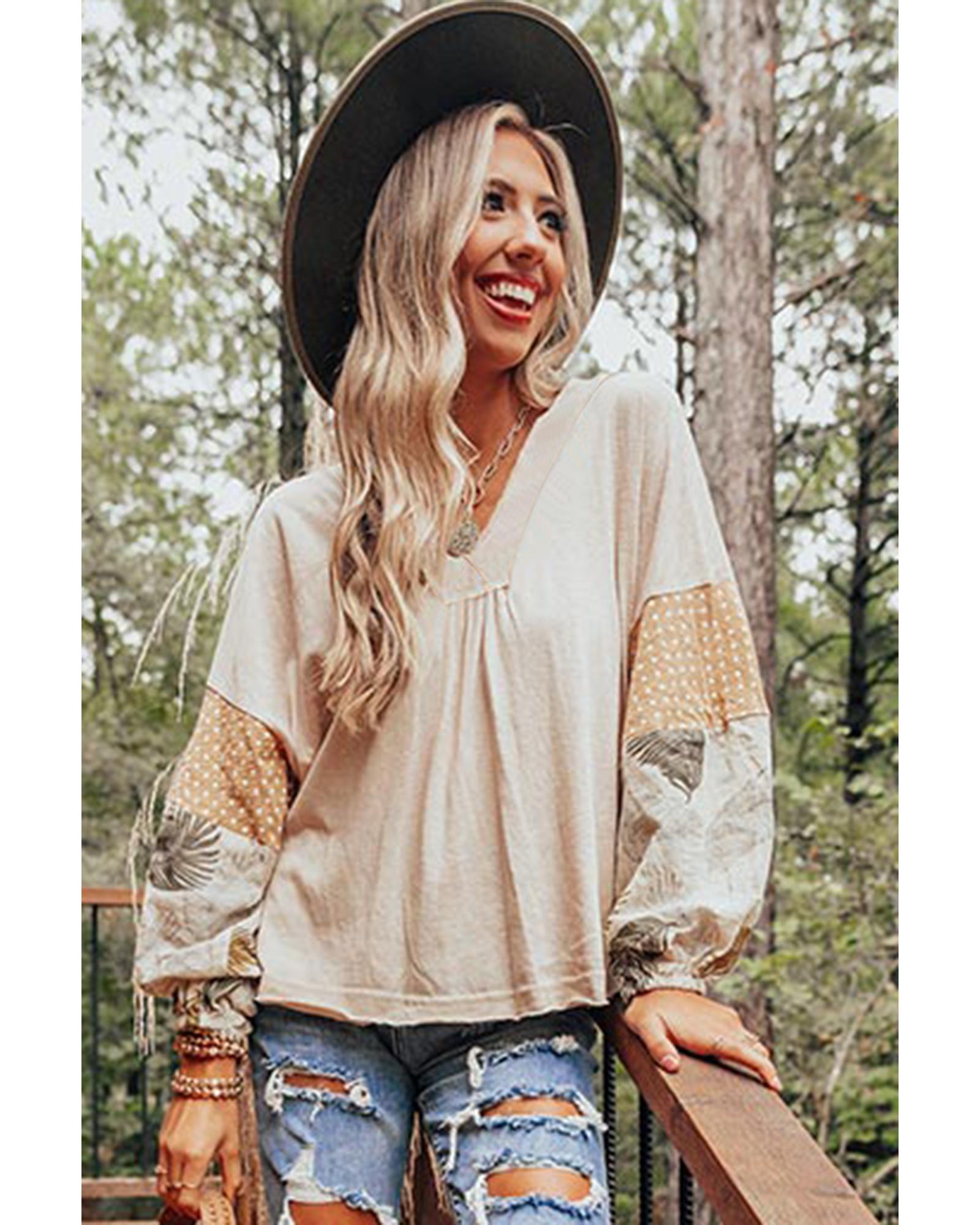 Jet Stream Palm Leaves Polka Dot Puff Sleeve Patchwork V Neck Loose Blouse – XL