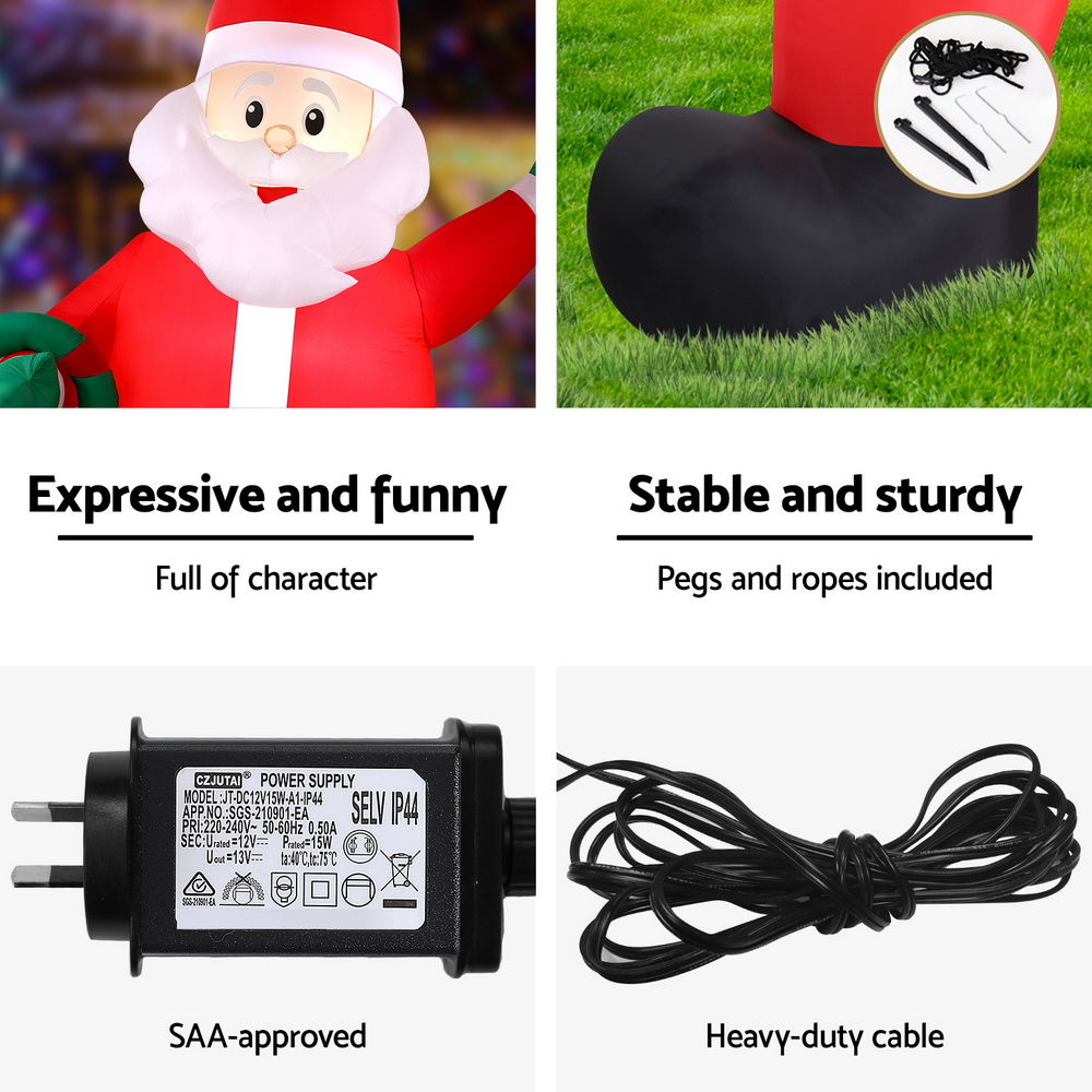 Make your holidays magical with this 3.8m tall Christmas inflatable featuring giant Santa! The built-in LEDs create a brilliant nighttime glow, perfect for spreading holiday cheer.