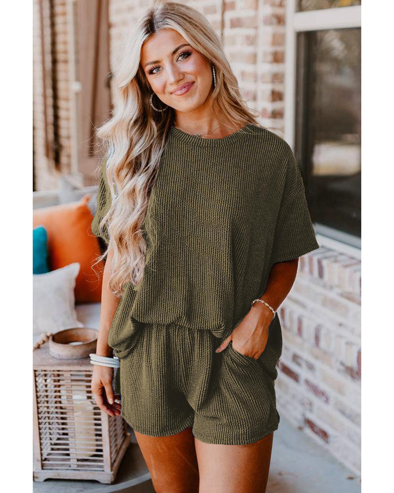 Jungle Green Ribbed Textured Knit Loose Fit Tee and Shorts Set – L