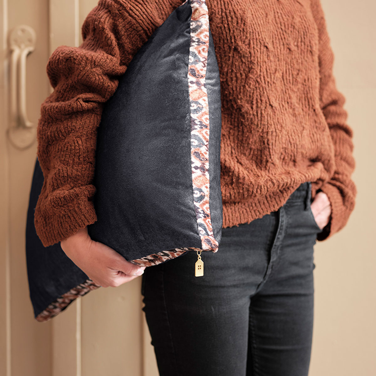 The KAAT Amsterdam Julan Anthracite Velvet Oblong Filled Cushion 40cm x 60cm is an elegant and timeless cushion, with a modern twist! The side features a vibrant ornamental print in ethnic Ikat motifs, in taupe, brown, black, grey, and white. The cushion pairs really well with the Kensi decorative pillow by KAAT Amsterdam. The backside of the cushion is in a plain anthracite colour. Decorative cushion Julan is made of 100% polyester velvet. The size is 40 x 60 cm. The cushion has a zipper at the bottom and comes with a resilient polyester inner cushion. Nice detail: the cushion has a golden puller at the zipper in the shape of an Amsterdam canal house. The cushion is not suitable for machine washing or tumble drying.