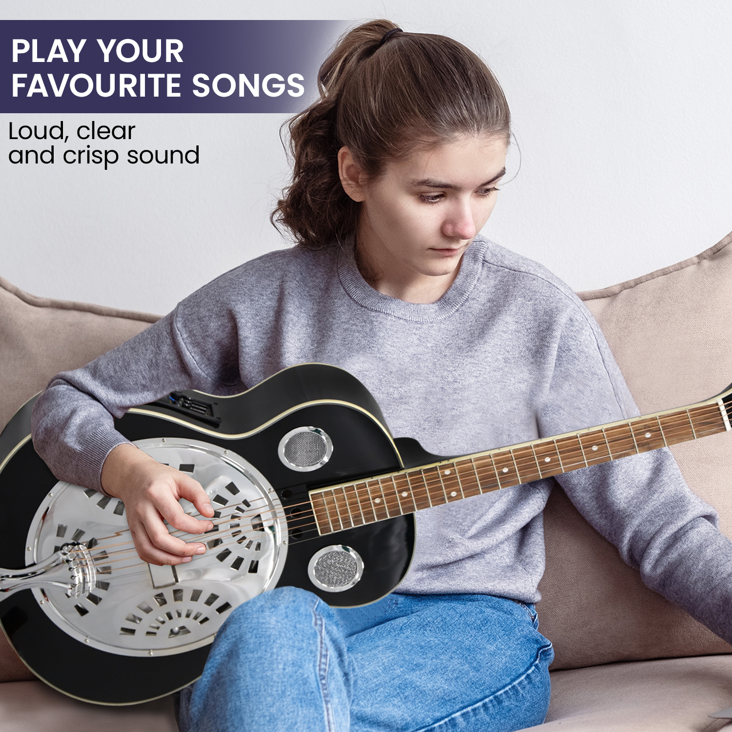 Expand your musical horizons and be mesmerized by the beautiful tone of the Karrera 40-inch Resonator Guitar! Made from high-quality wood and steel, this 6-stringed guitar is incredibly sturdy for everyday practice. Its material and shape produce a loud and crisp tone emanating from its metal plate for a truly distinctive acoustic sound that’s sure to impress.
