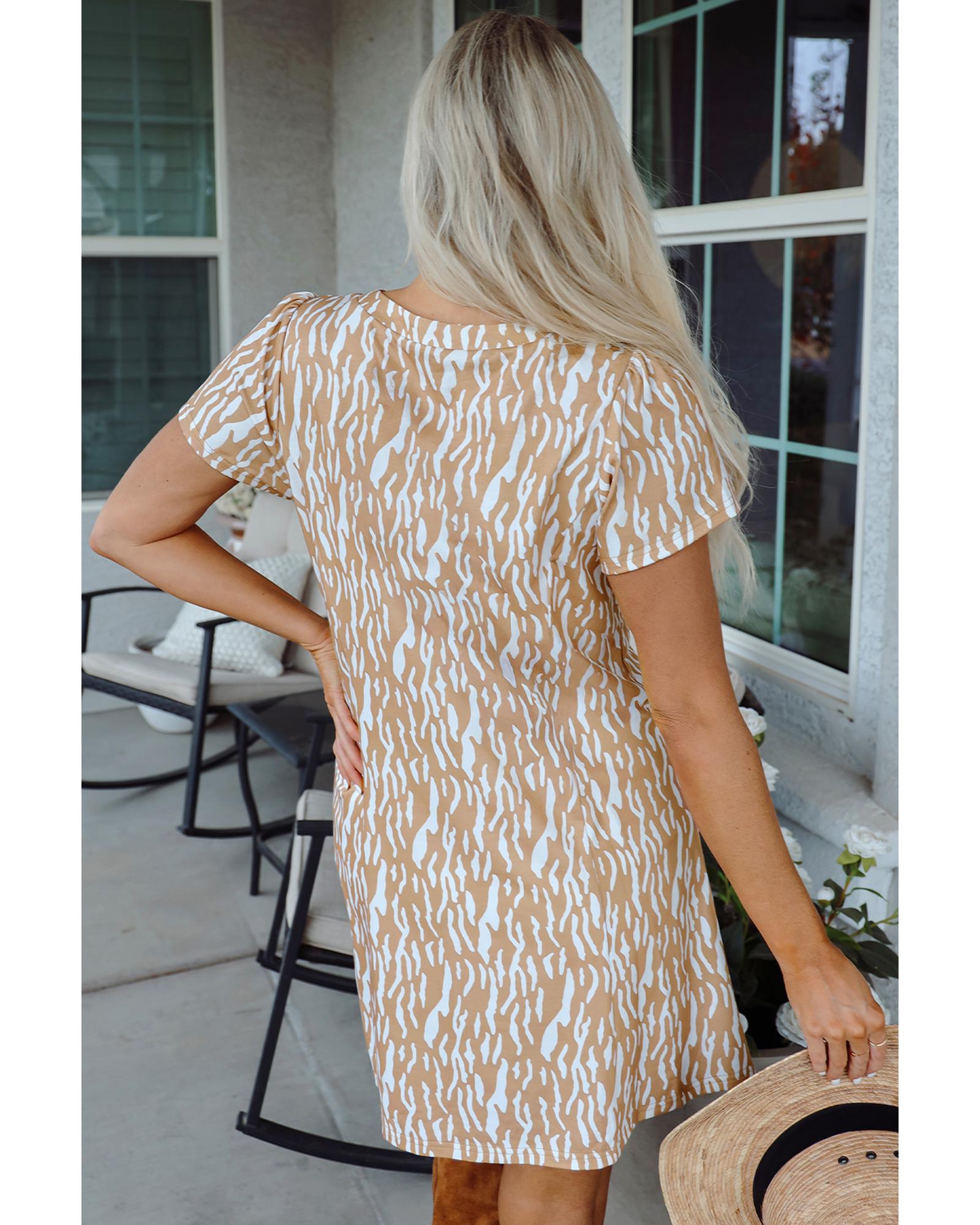 Khaki Abstract Print V Neck Short Sleeve Shift T Shirt Dress – M