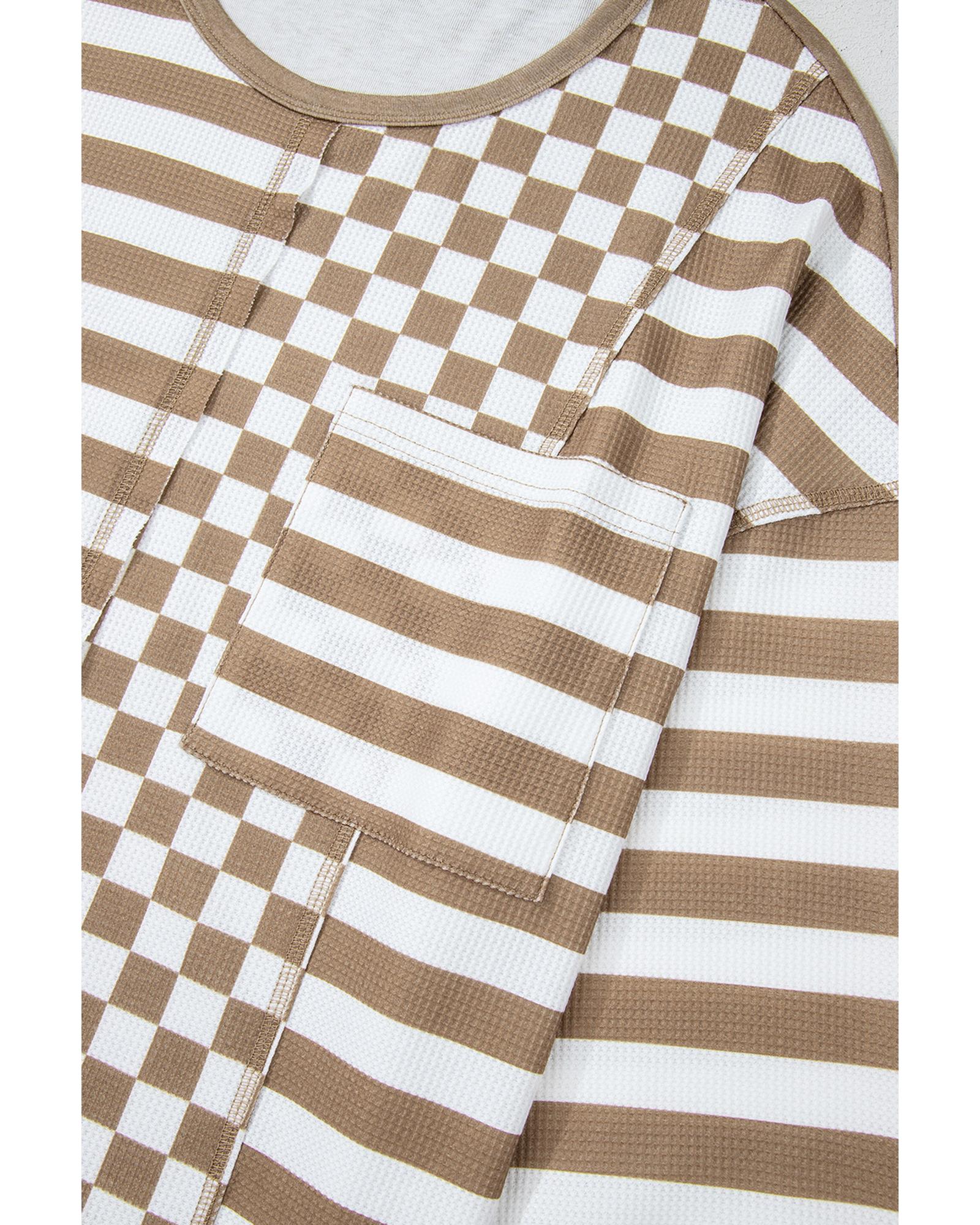 Khaki Checkerboard Striped Patchwork Lantern Sleeve Pocketed Blouse – S