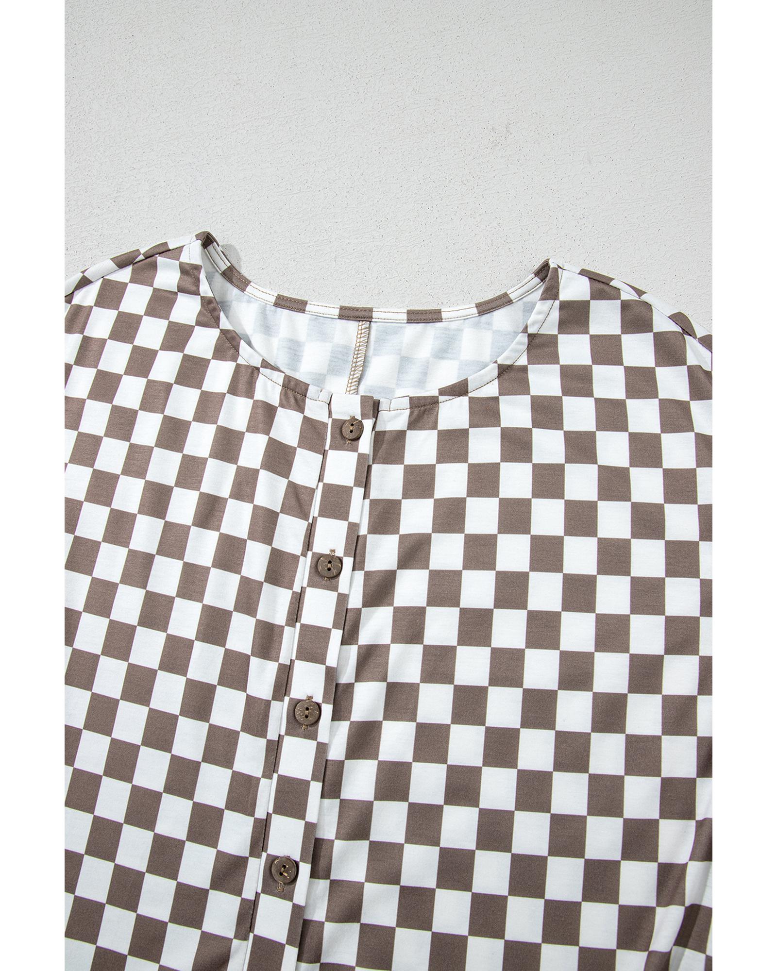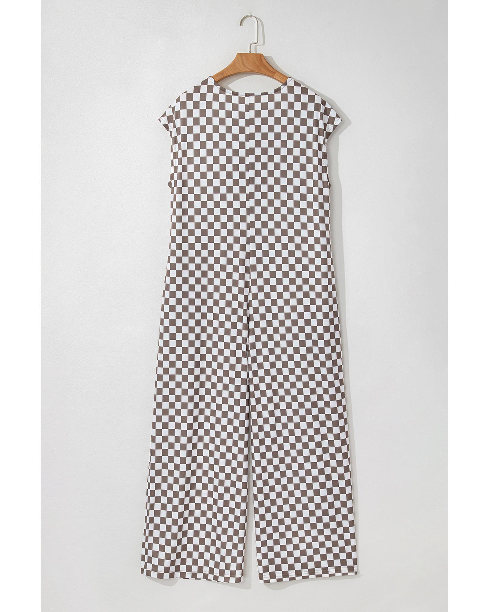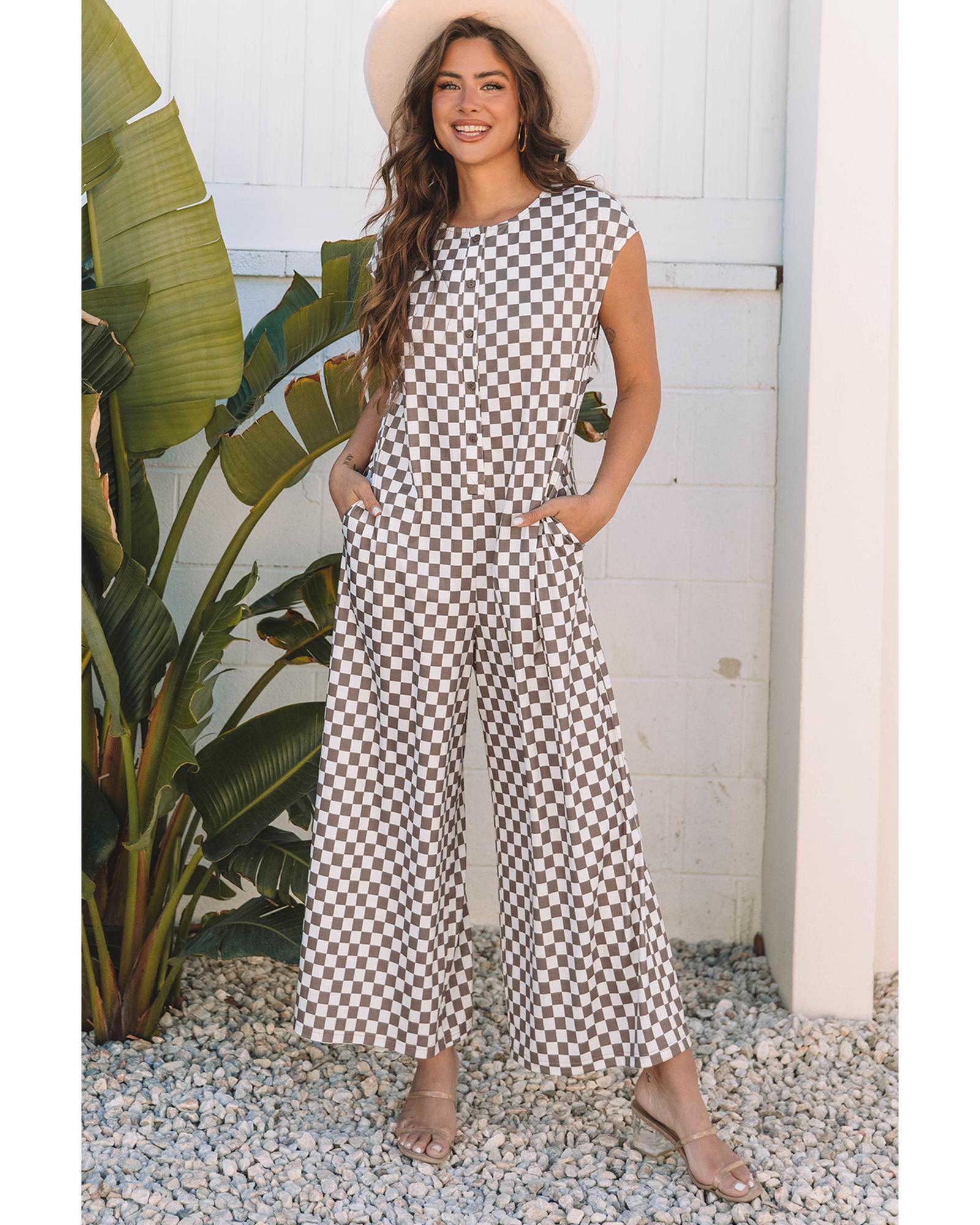 Khaki Checkered Print Buttoned Crew Neck Wide Leg Jumpsuit – L