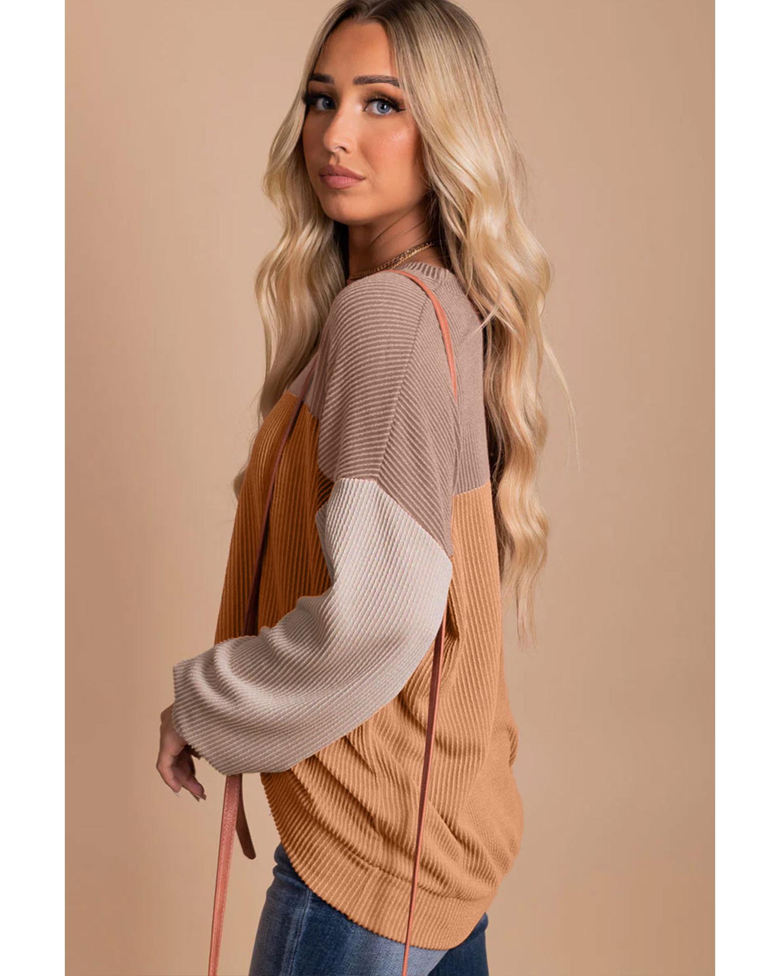 Khaki Color Block Long Sleeve Ribbed Loose Top – L