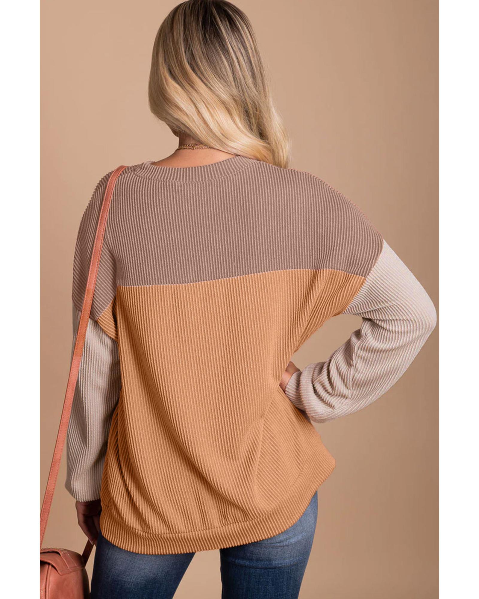 Chic and effortless look Bold and eye - catching color block design Ribbed texture for a comfortable and flattering fit Long sleeves for added coverage Available in various sizes for women