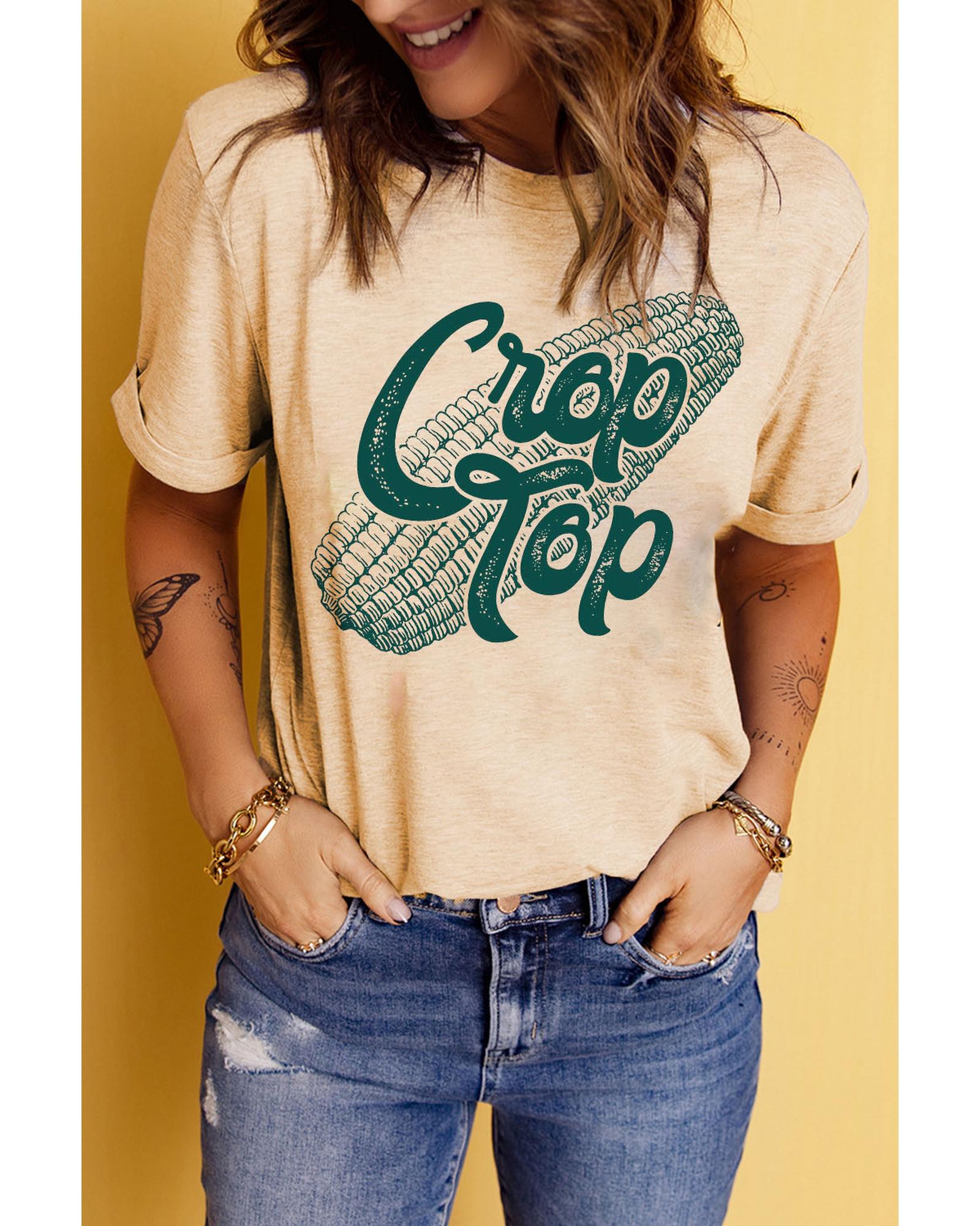 Stylish and trendy Khaki Corn Crop Top Graphic Tee Made with high - quality materials for a comfortable fit Unique graphic design adds a touch of sophistication Available in multiple sizes for the perfect fit Pairs well with jeans or shorts for a casual and fashionable look Ideal for women who appreciate luxury and style