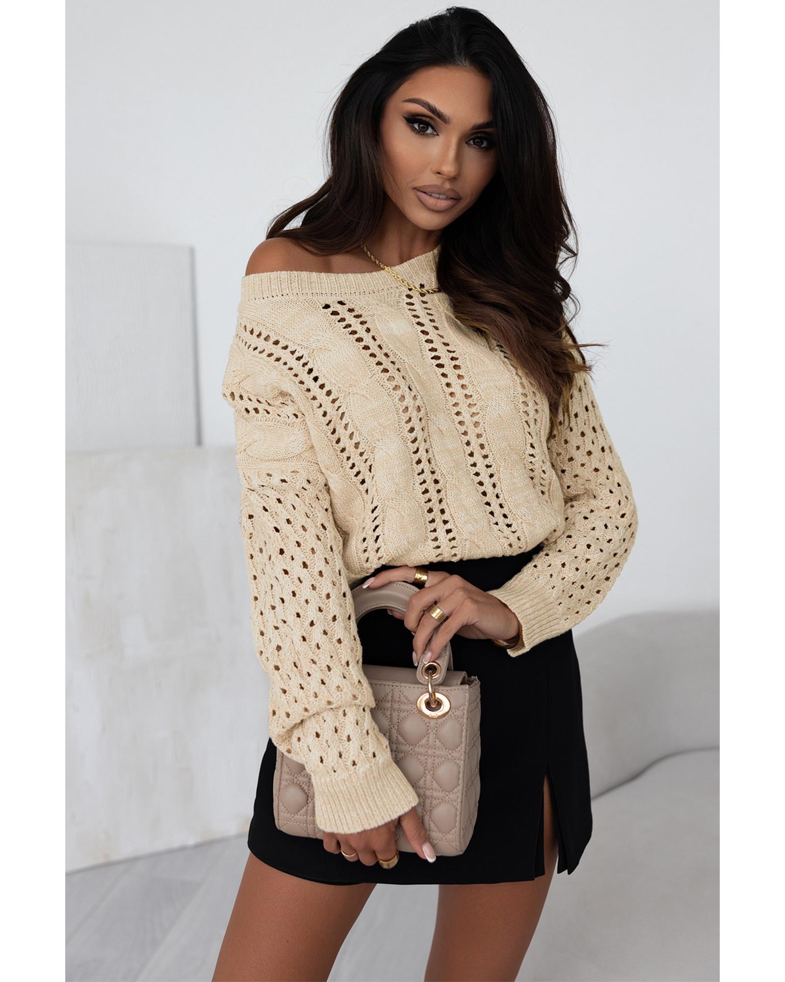 Khaki Eyelets Cable Knit Drop Shoulder Sweater – S