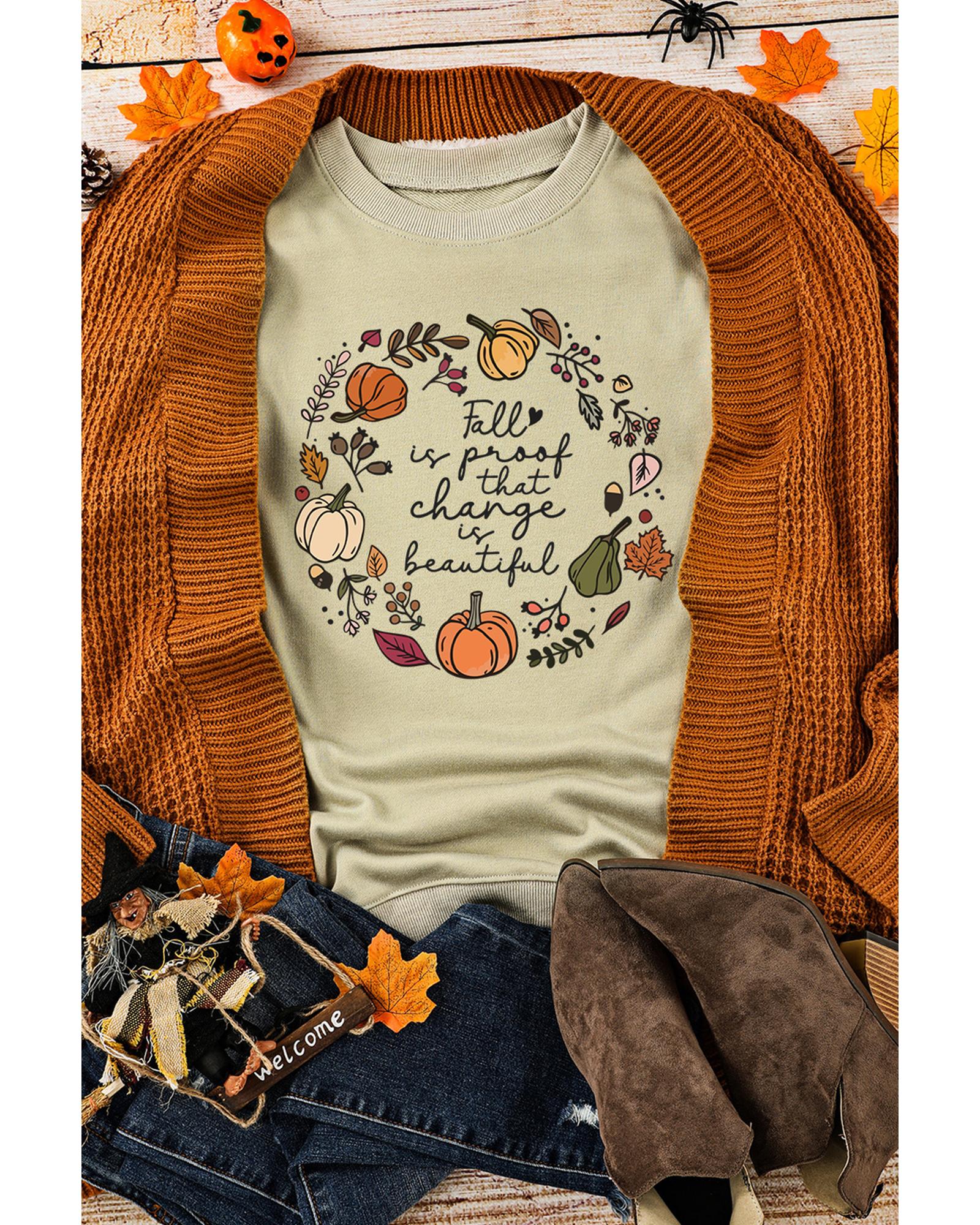 - Khaki Fall Vibe Pumpkin Print Round Neck Sweatshirt