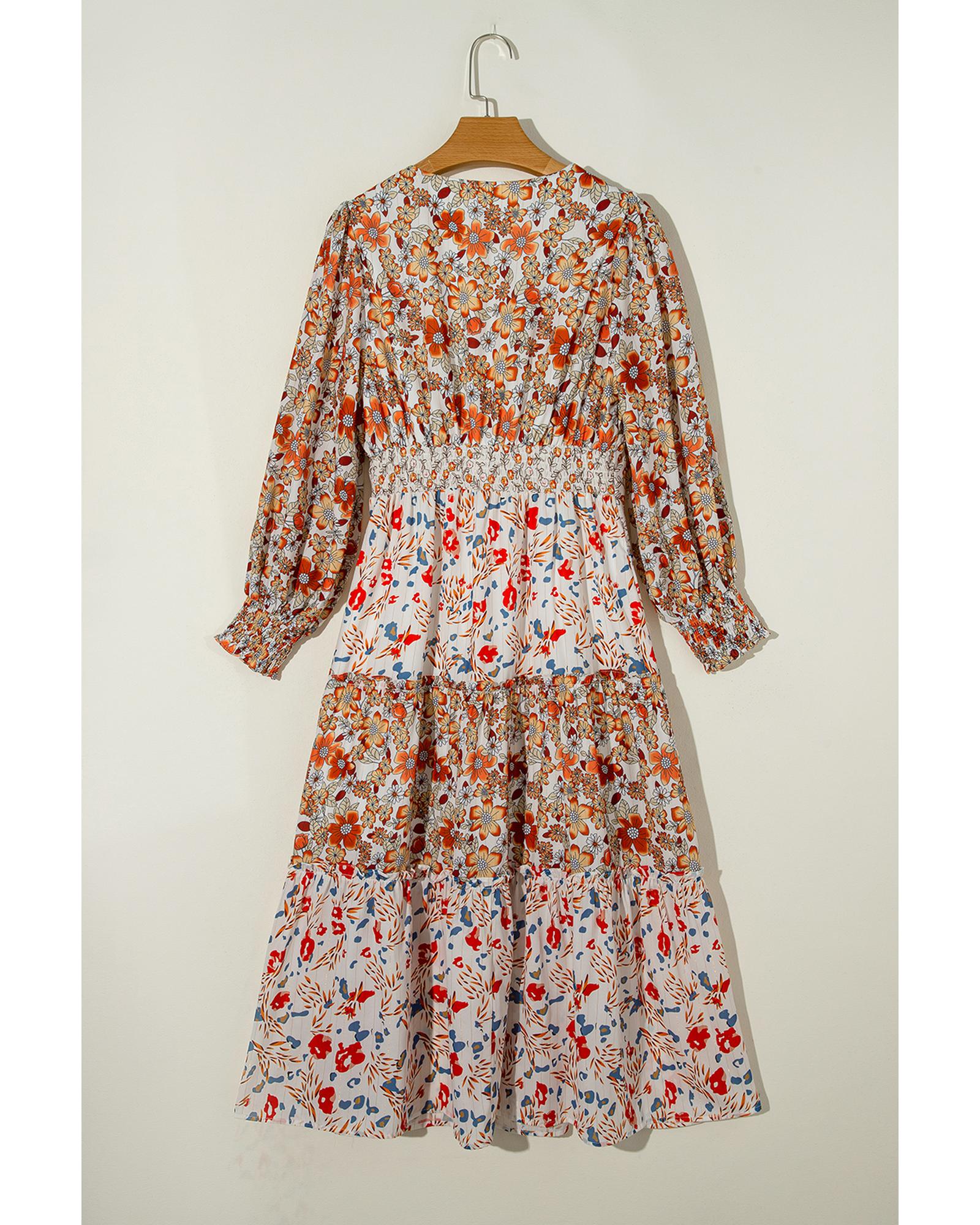 Khaki Floral Print Ruffled Tiered Long Sleeve V Neck Midi Dress - L