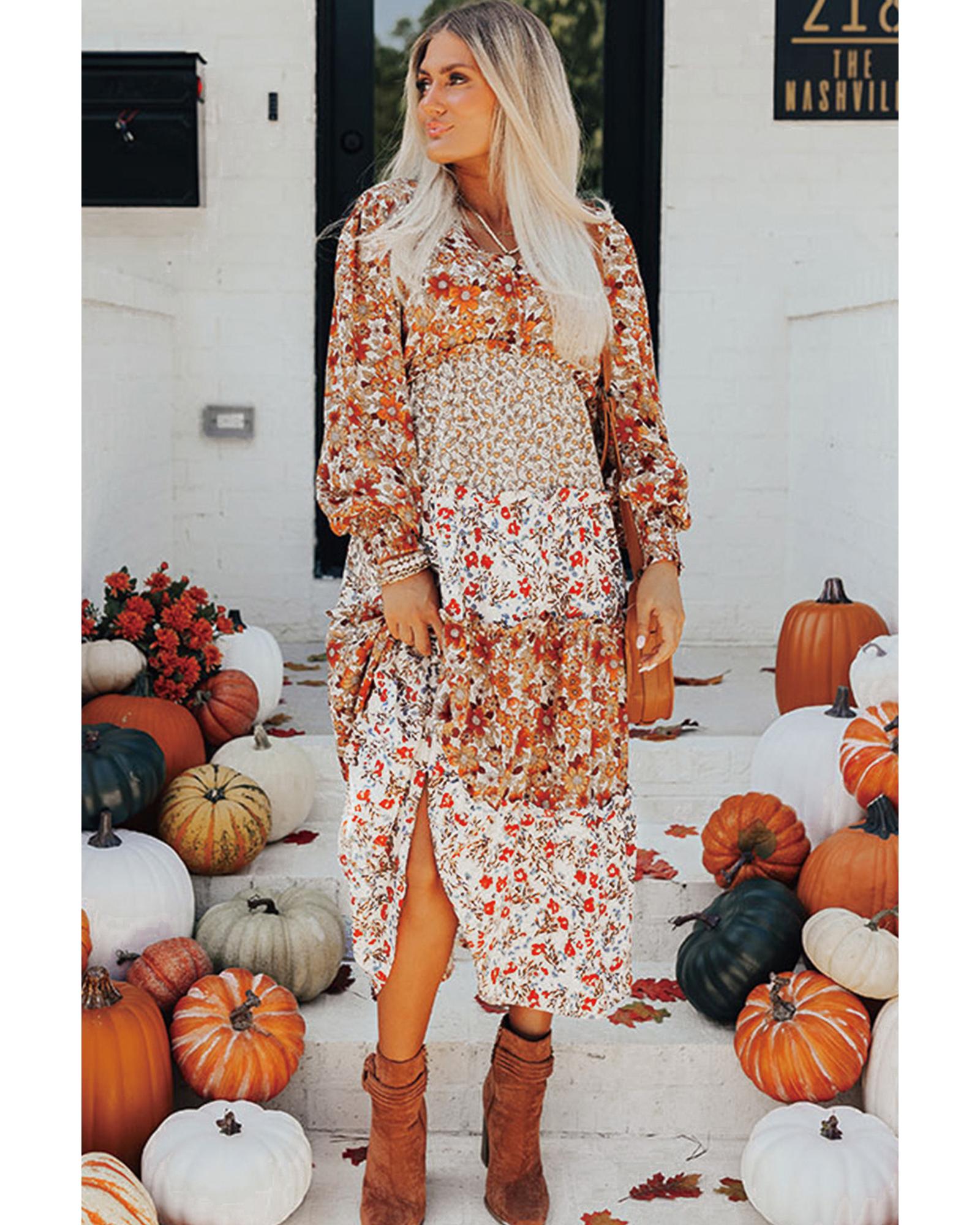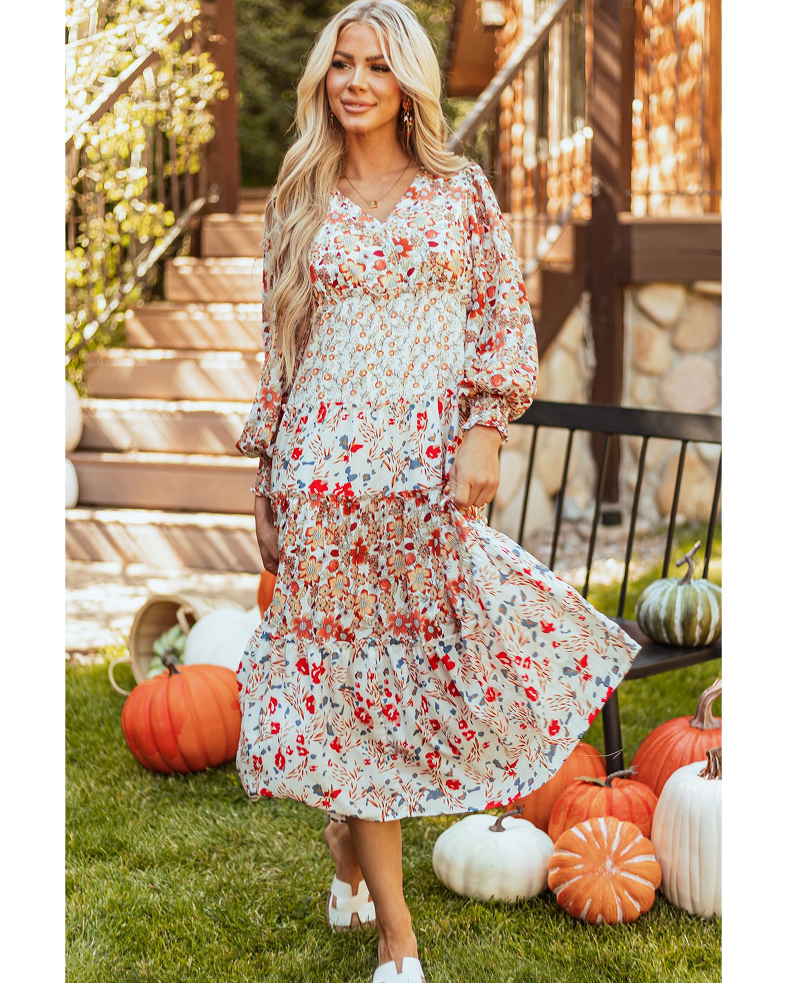 Khaki Floral Print Ruffled Tiered Long Sleeve V Neck Midi Dress – S