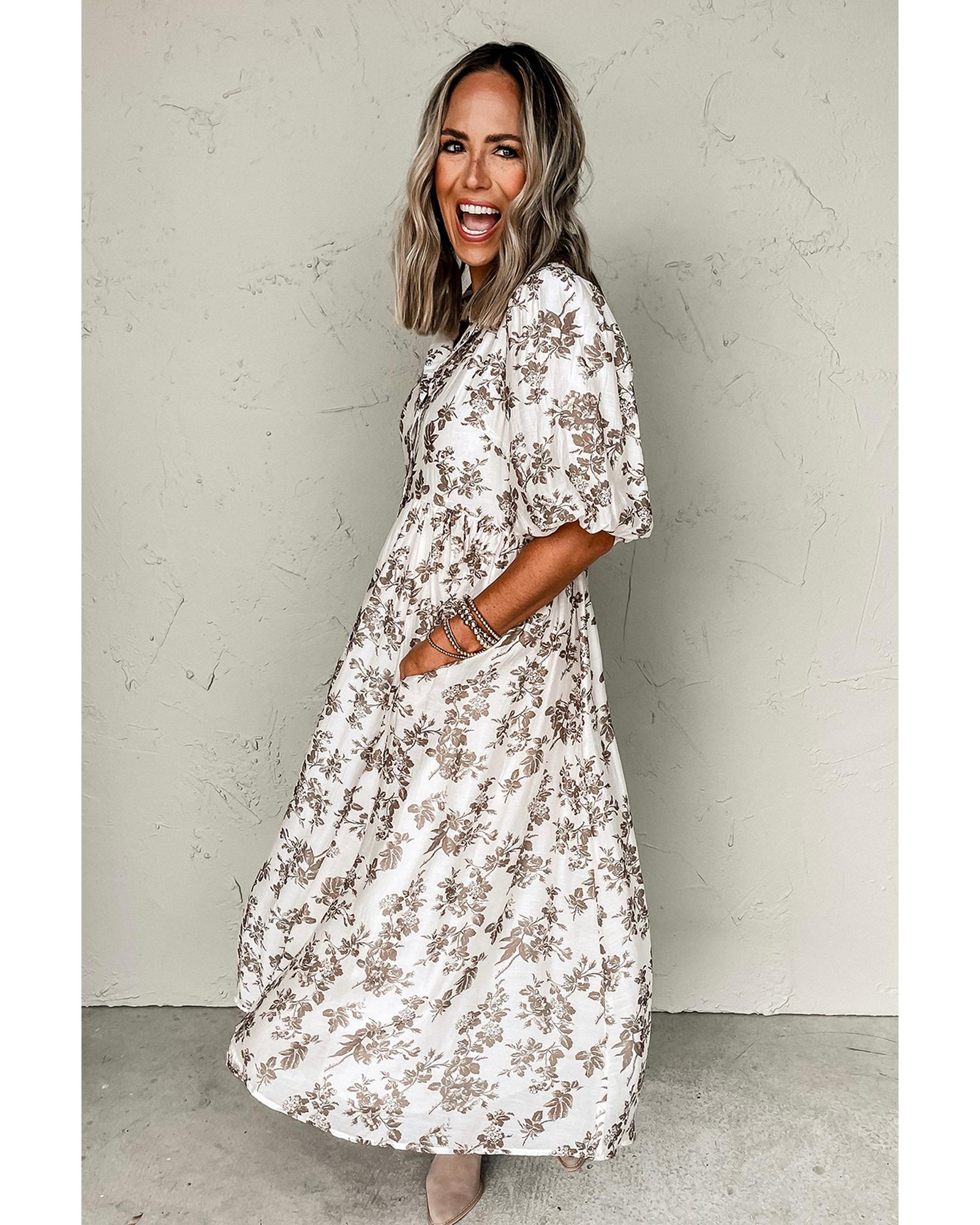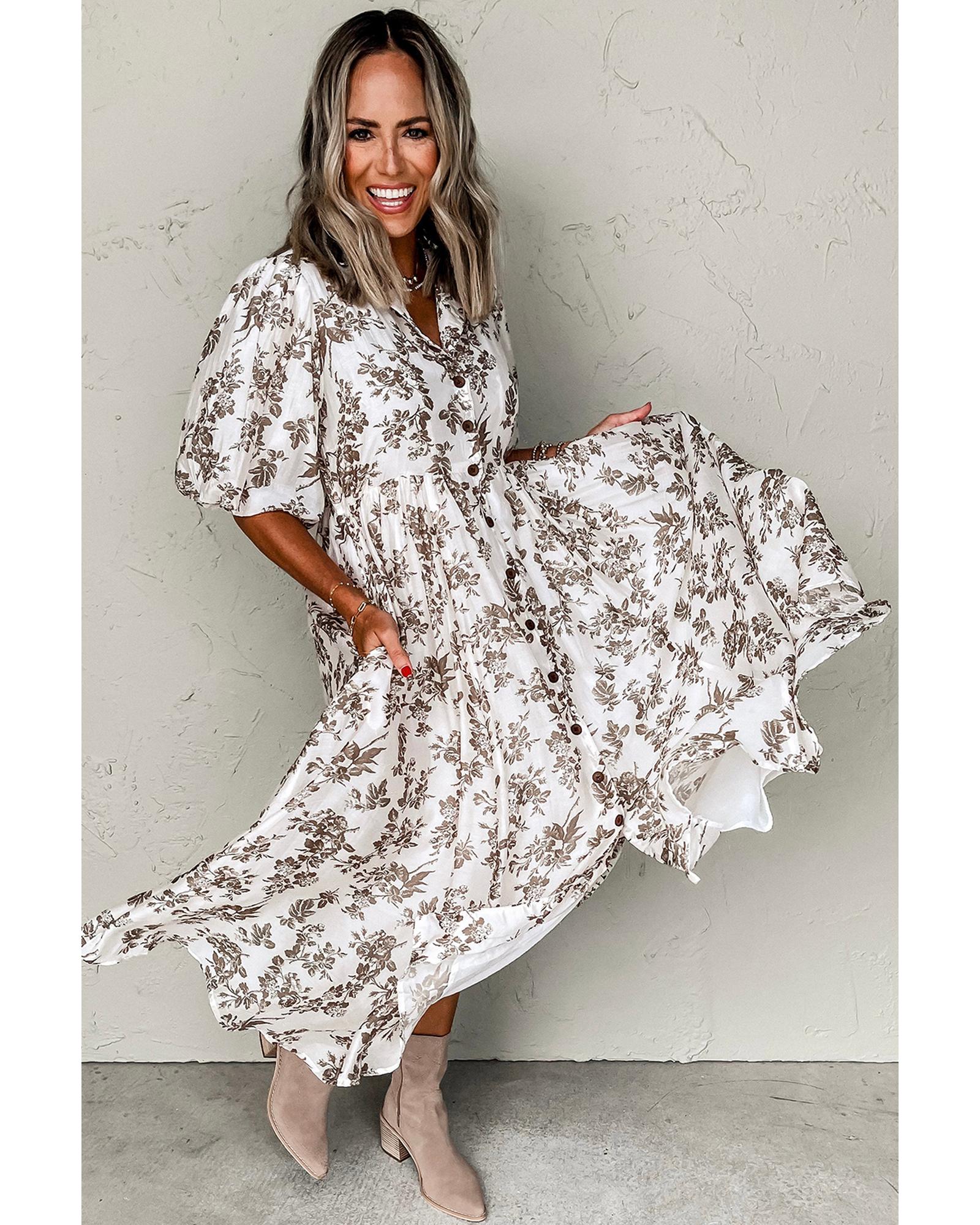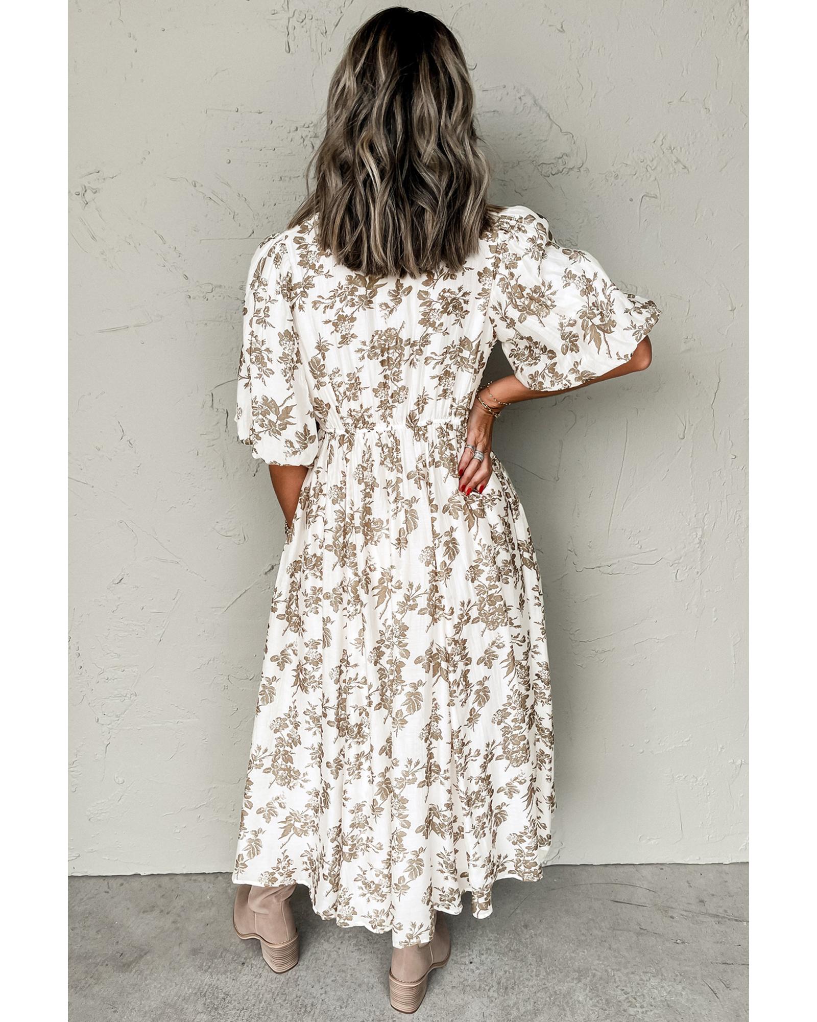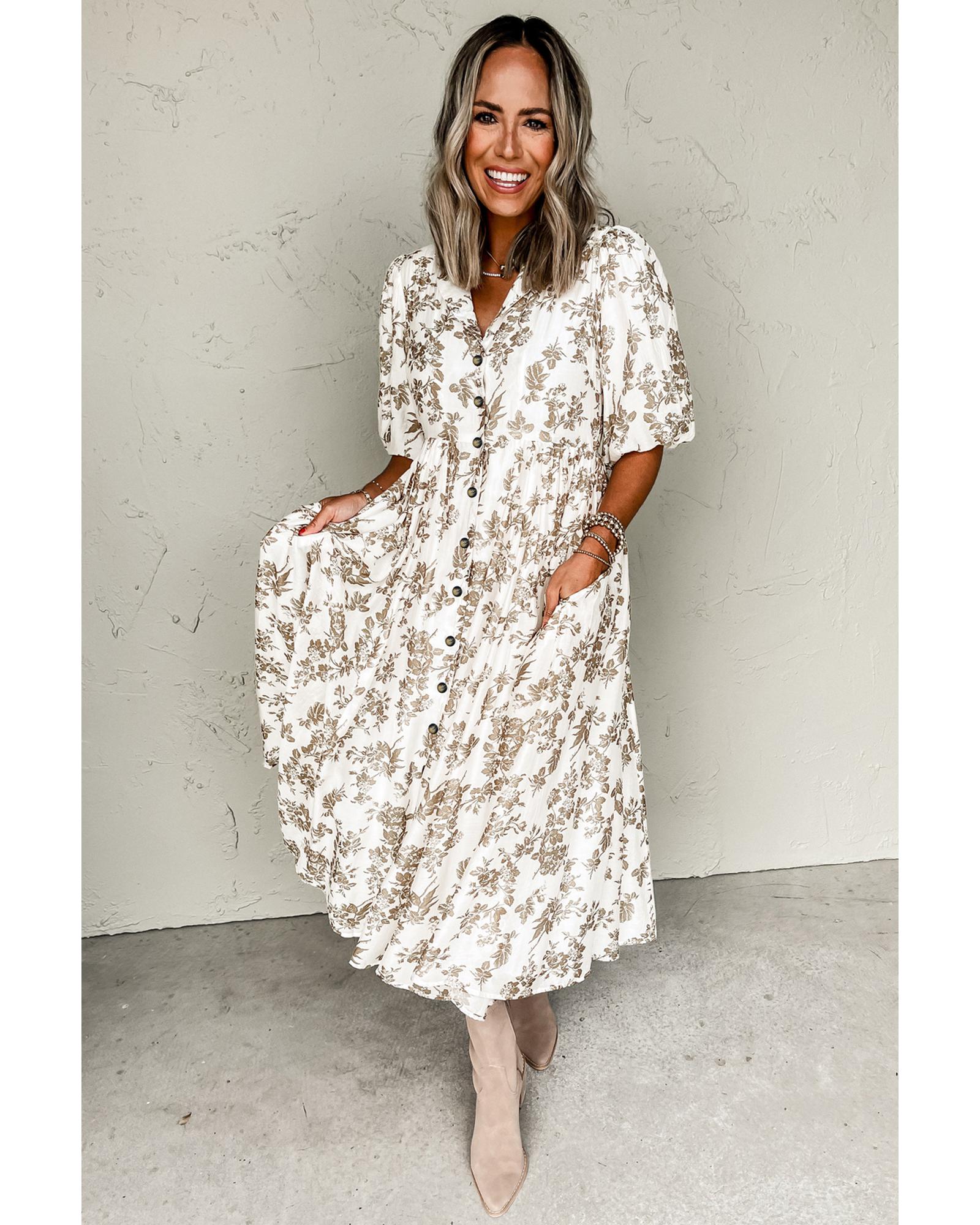 Khaki Floral Puff Sleeve V Neck Buttoned Front Maxi Dress – L