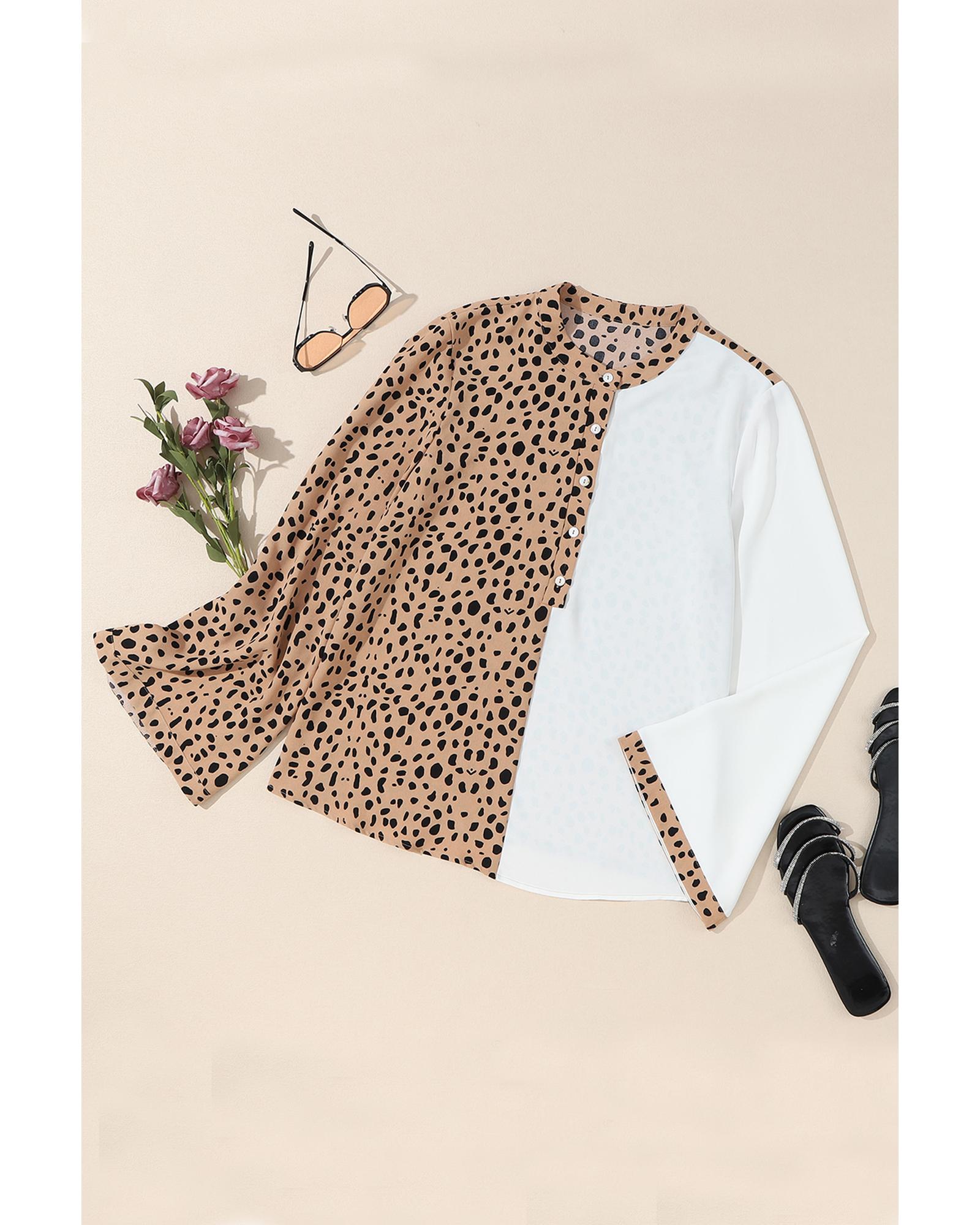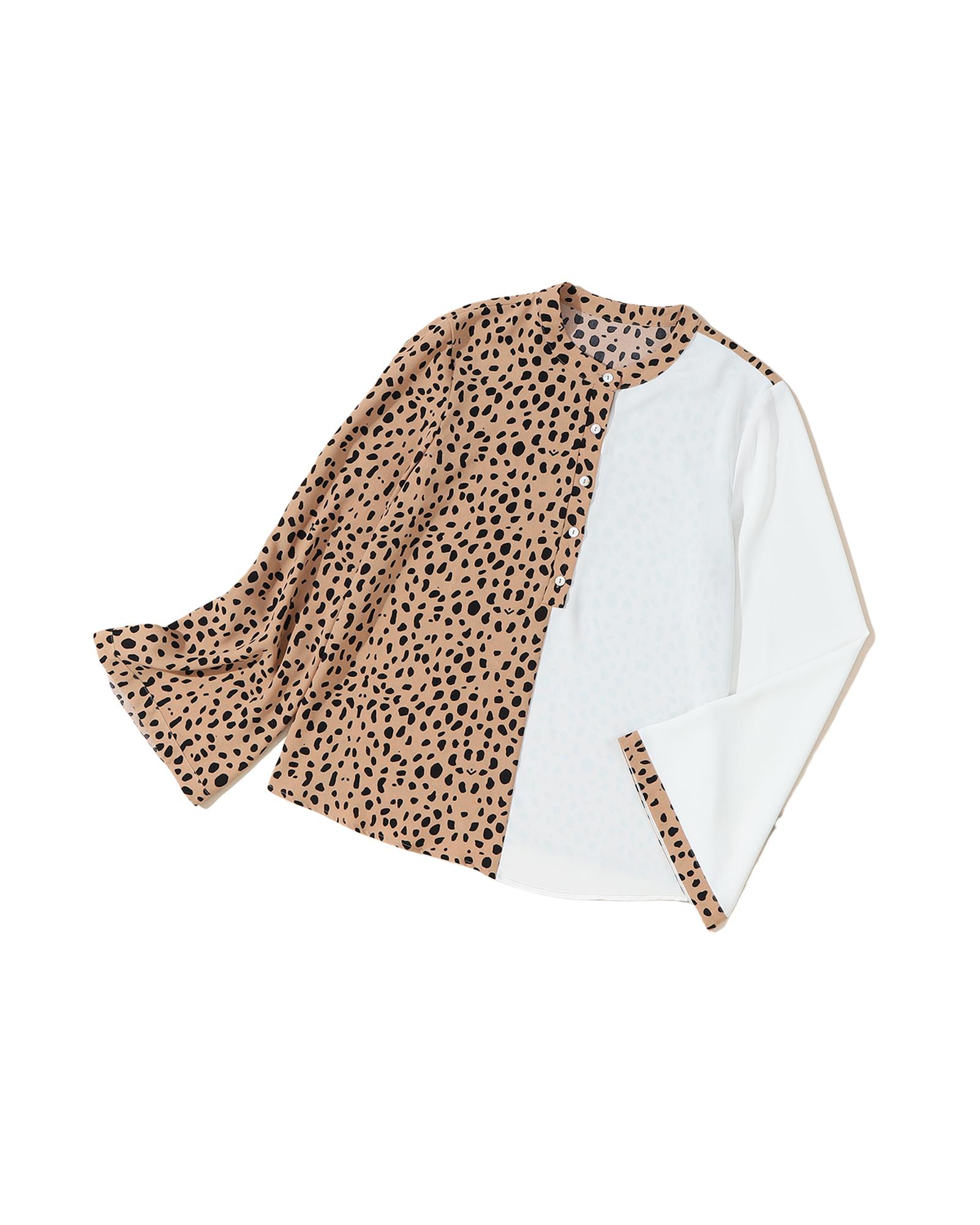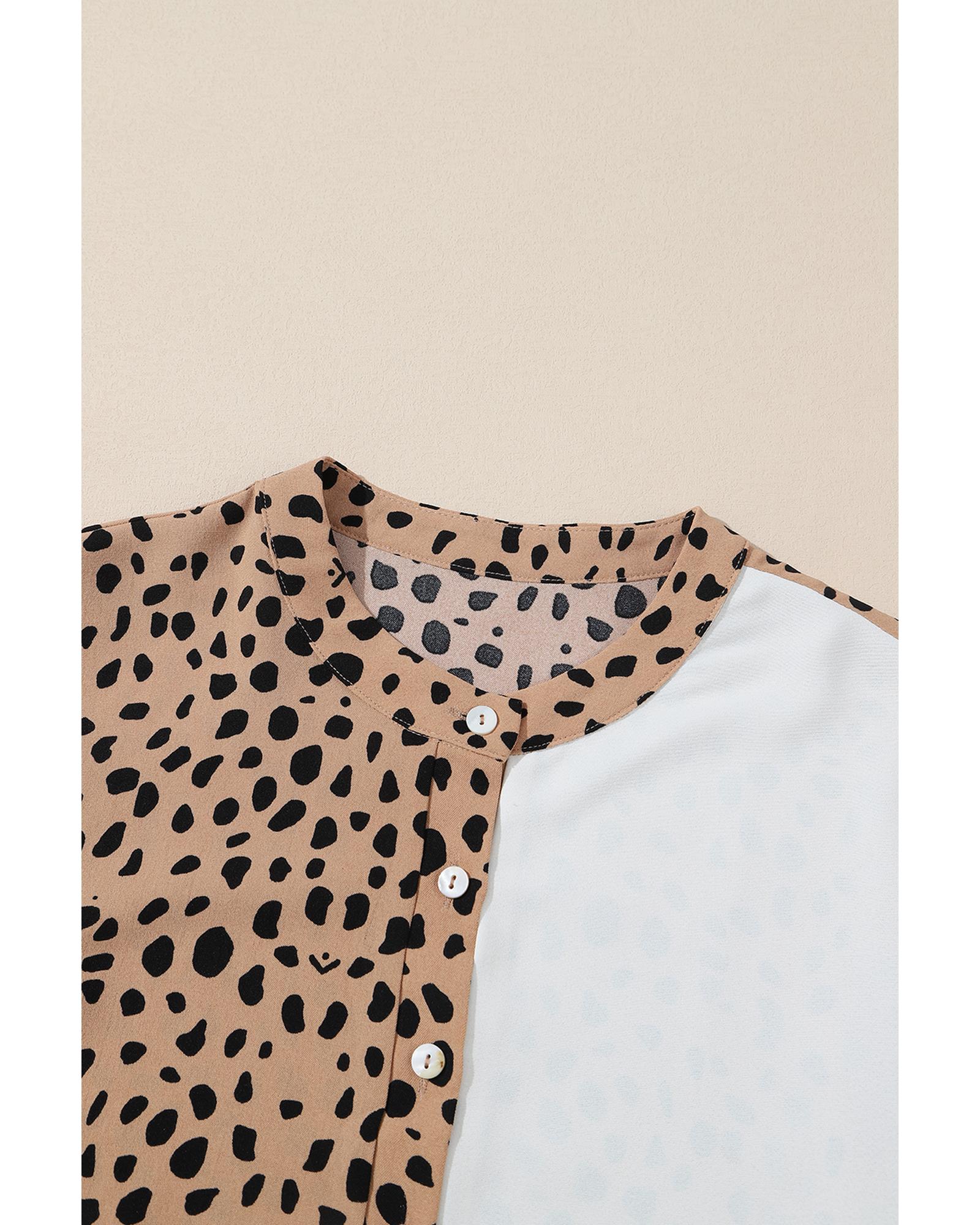 Khaki Leopard Contrast Half Button Casual Blouse – M
