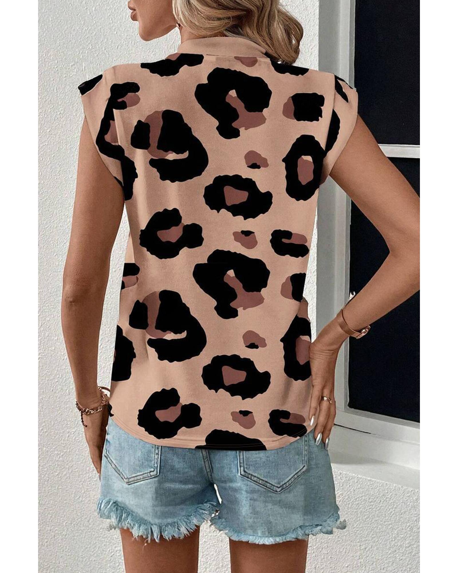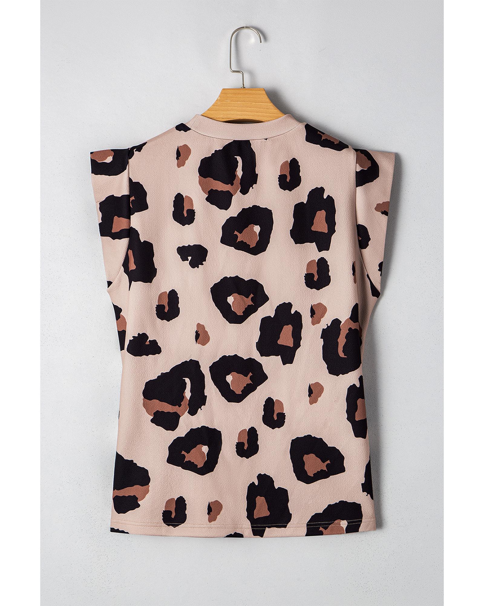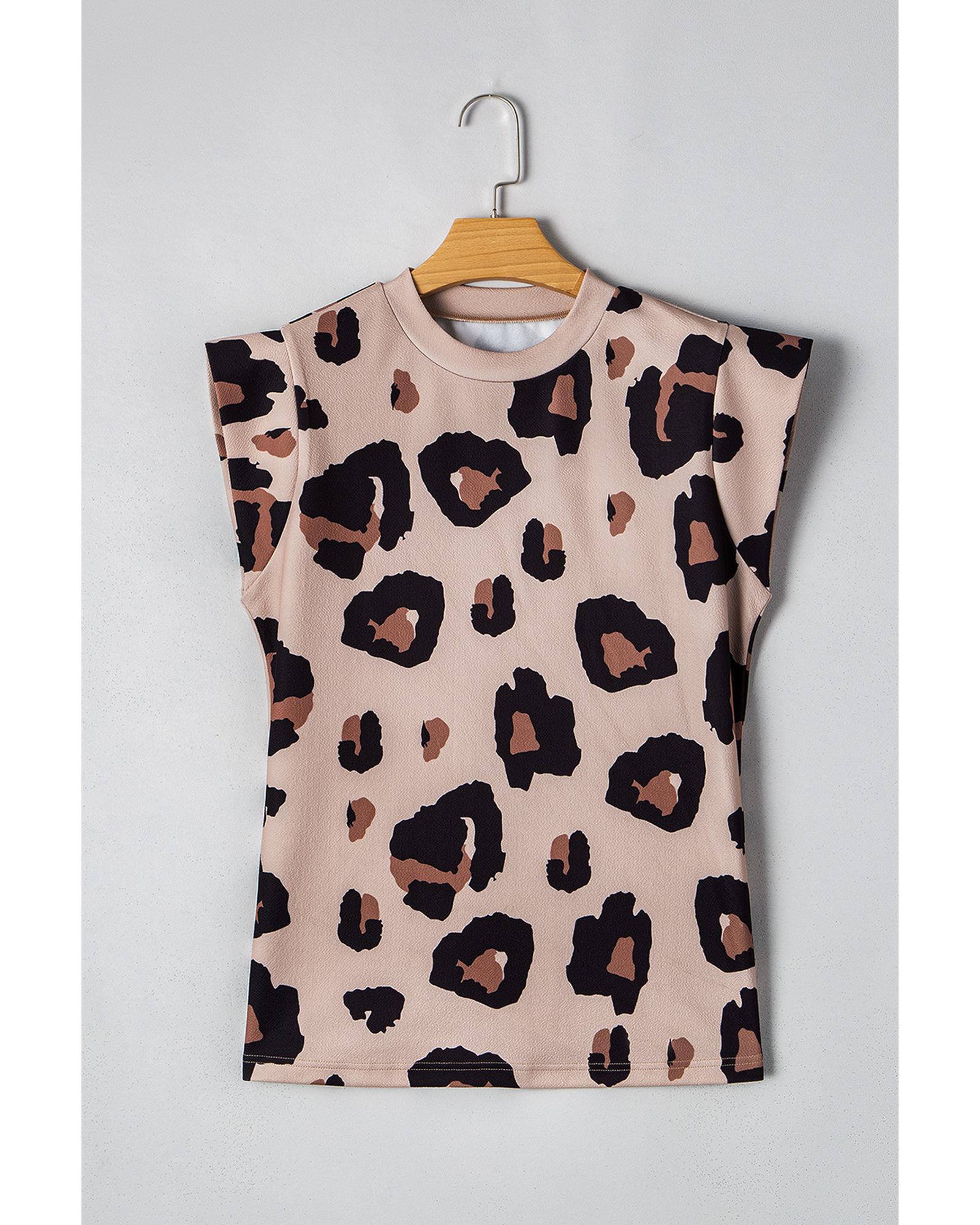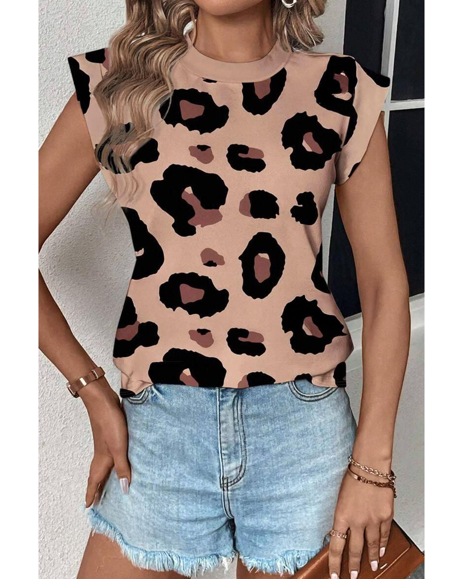 - Khaki Leopard Crew Neck Cap Sleeve Casual Tee