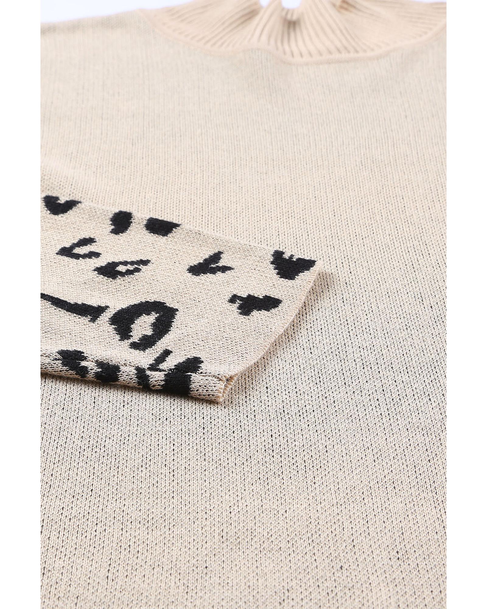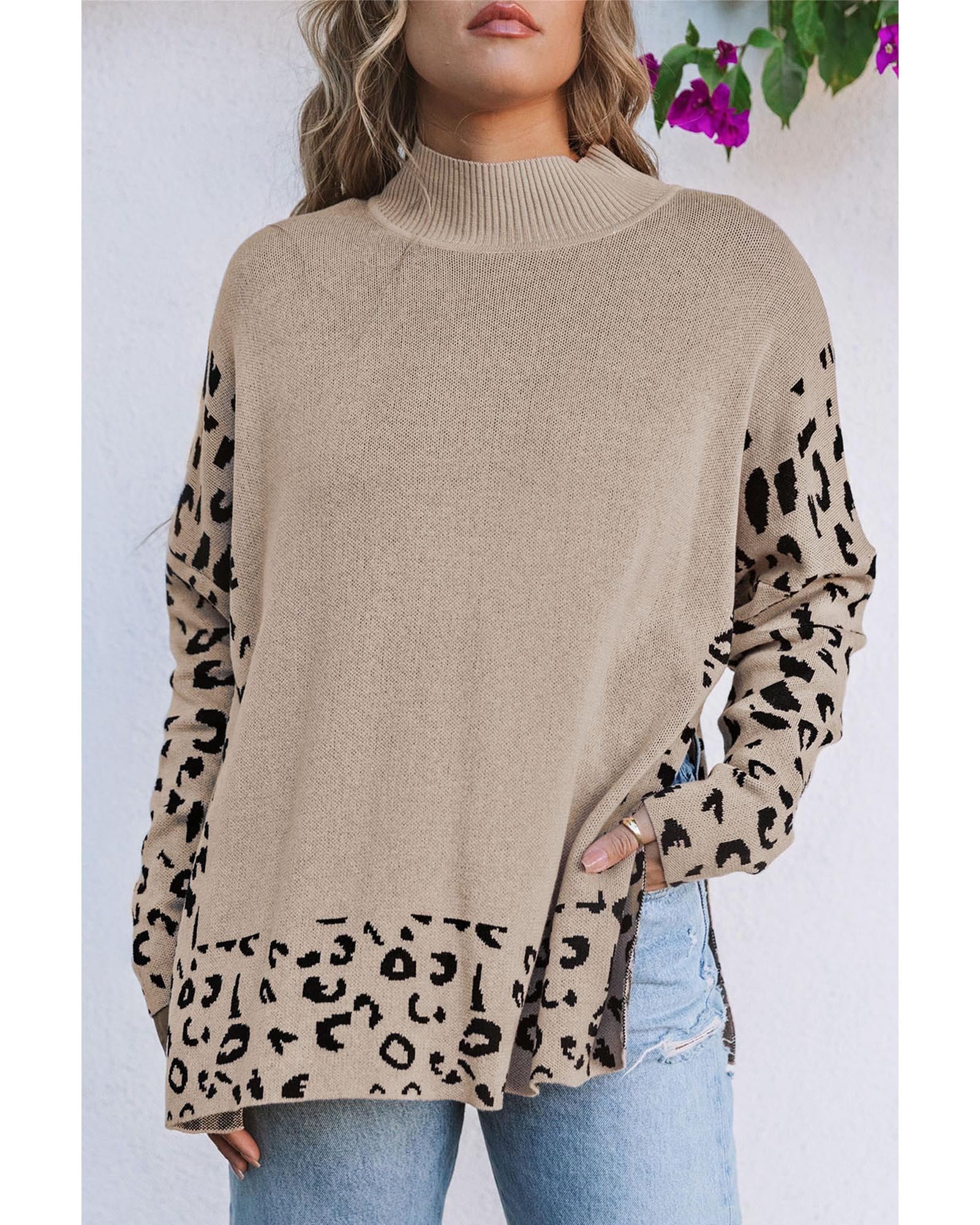 Khaki Leopard High Neck Side Slit Oversized Sweater – L