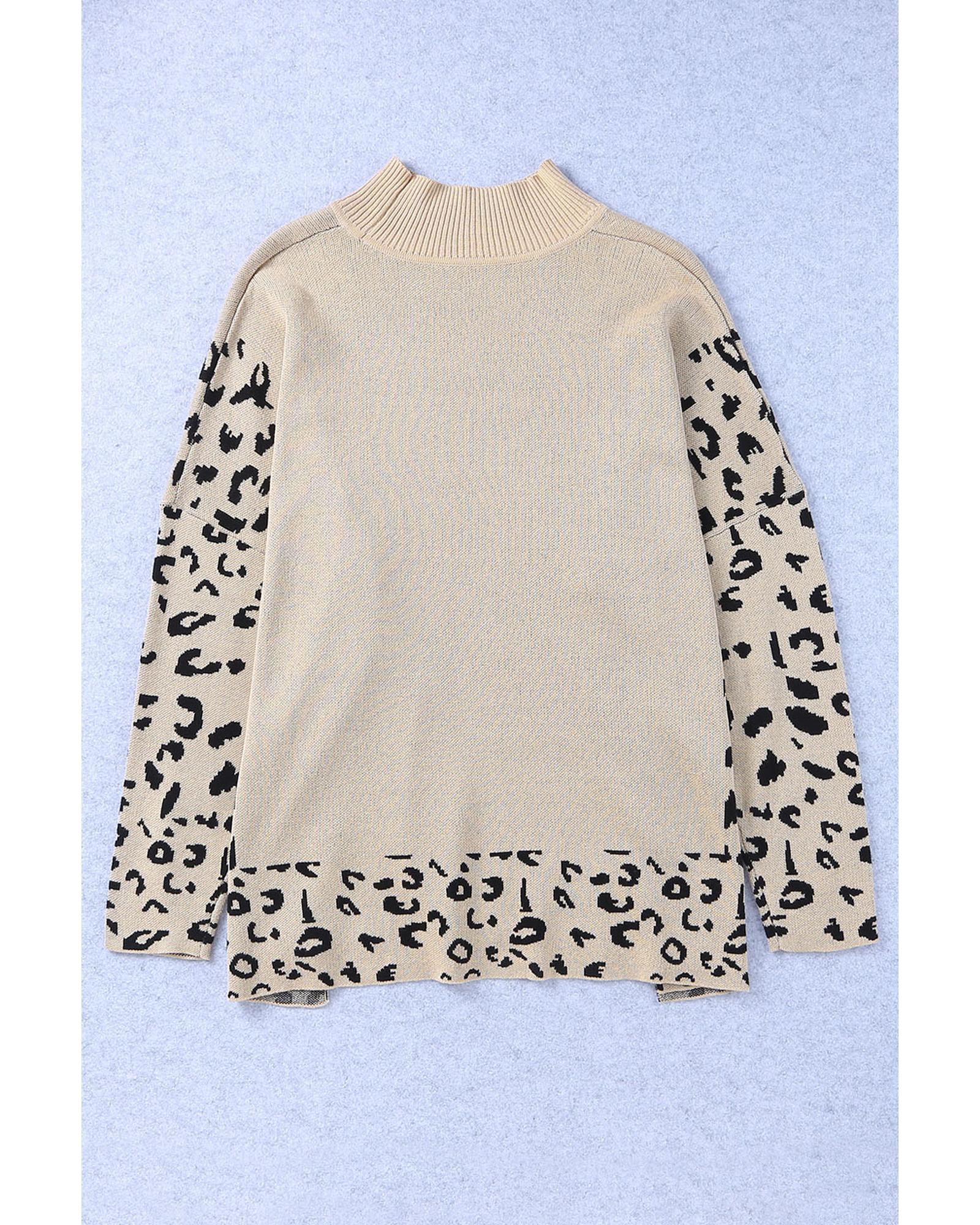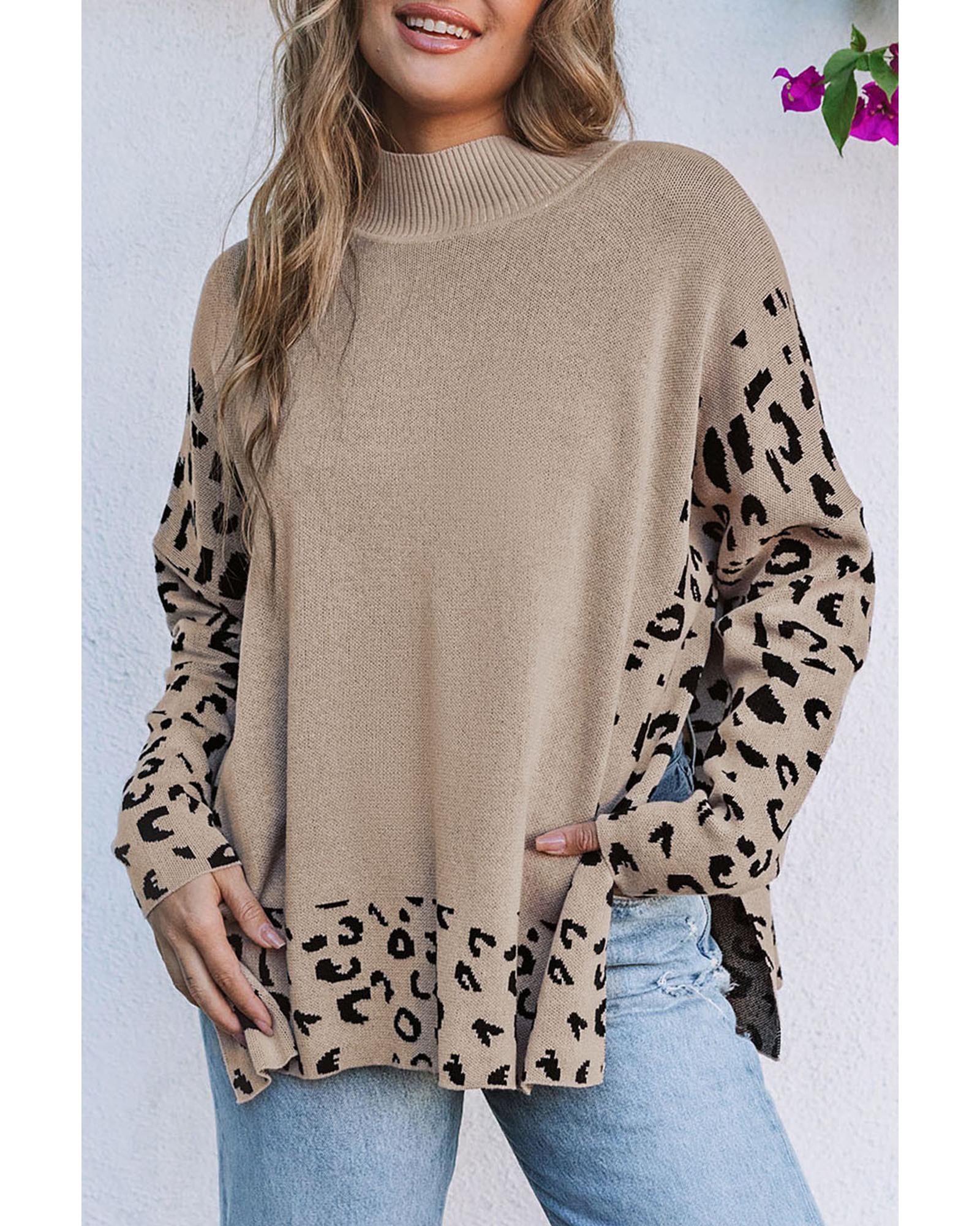 Khaki Leopard High Neck Side Slit Oversized Sweater – XL