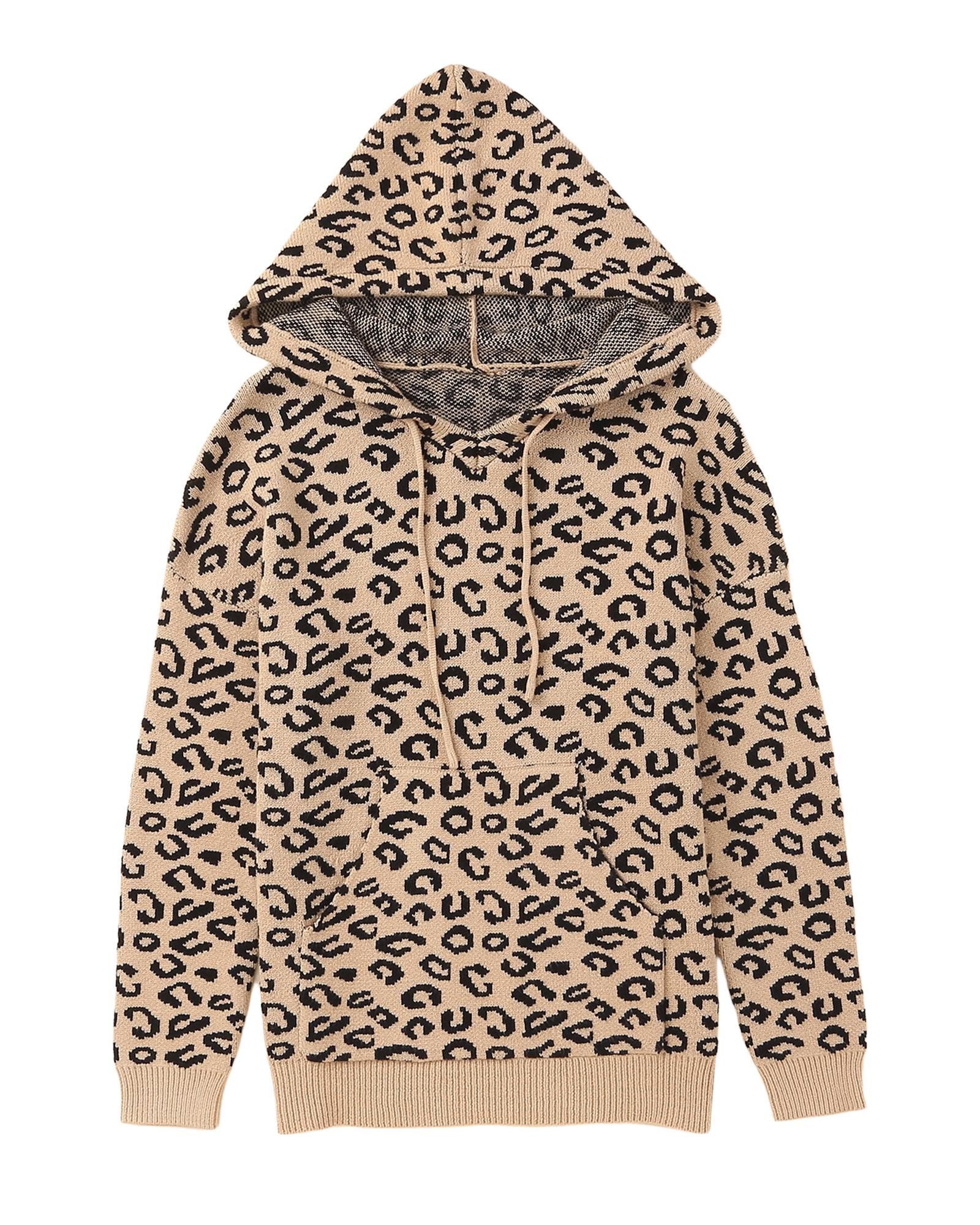 Khaki Leopard Knitted Drawstring Hooded Sweater – L