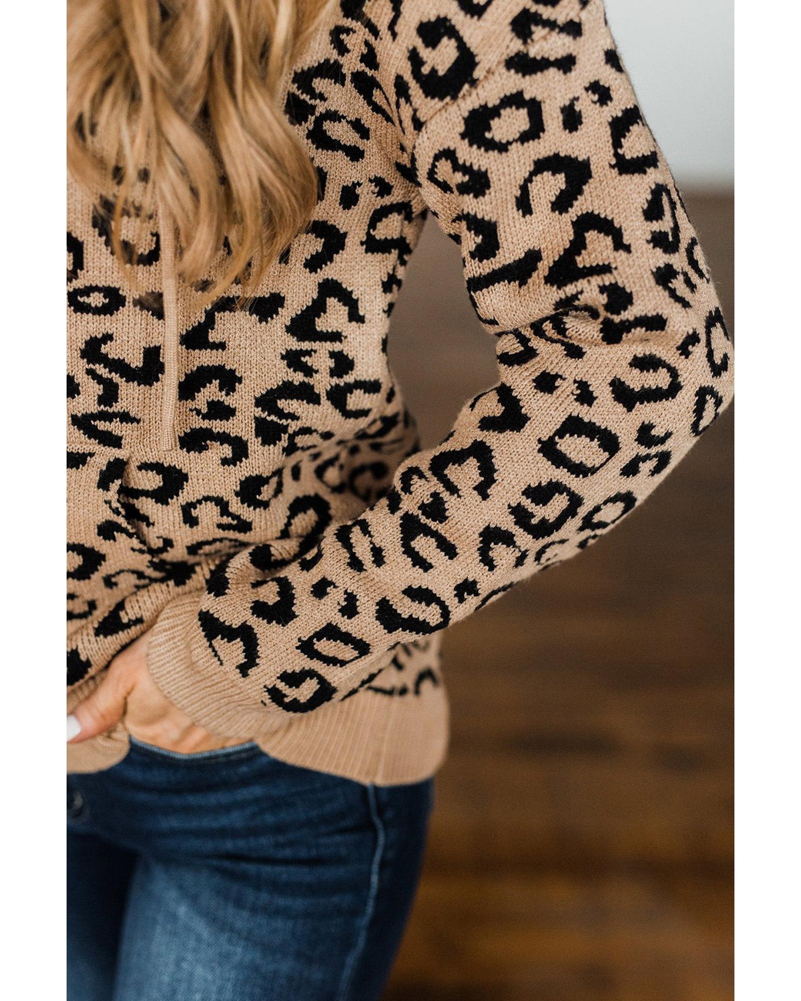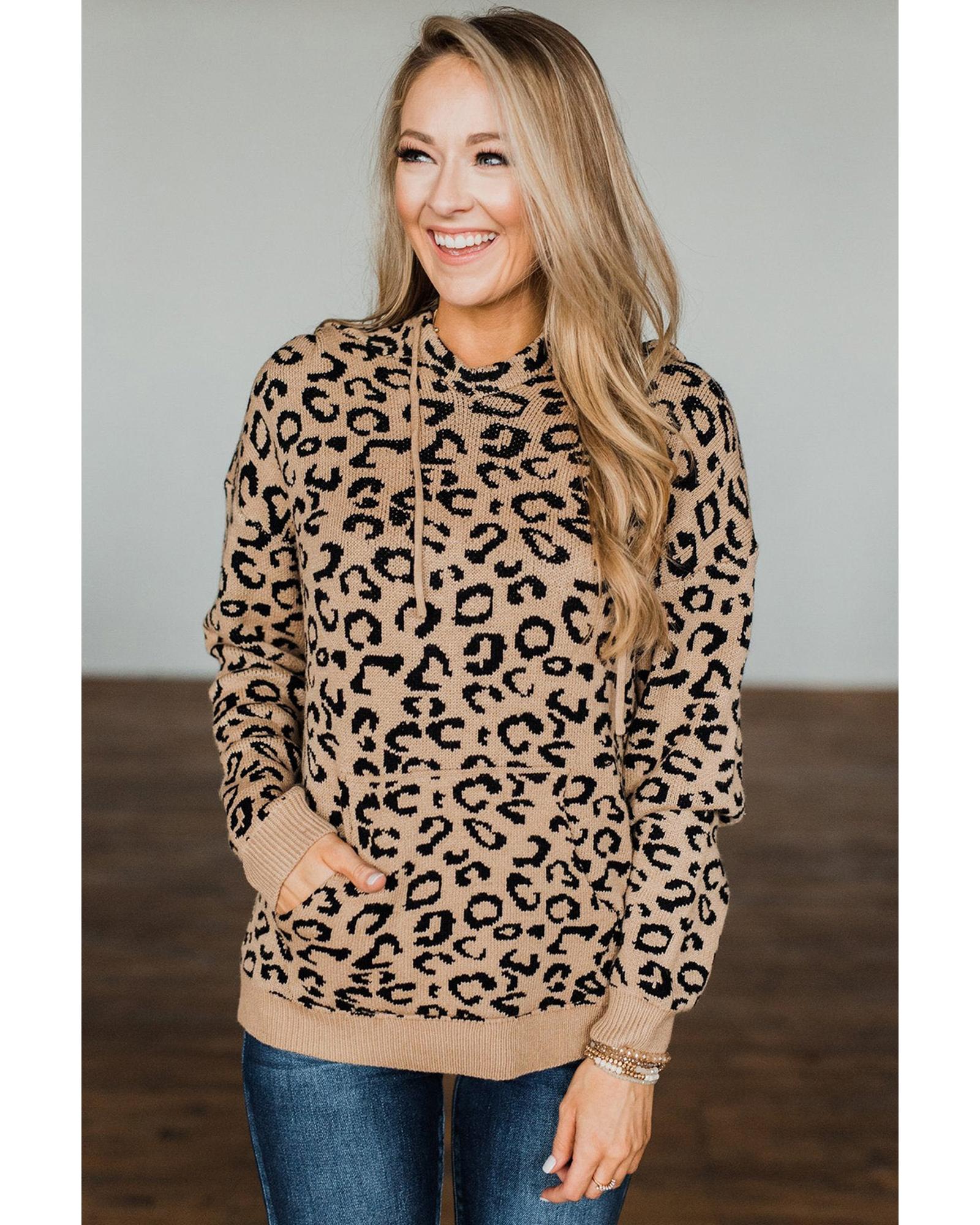 Khaki Leopard Knitted Drawstring Hooded Sweater – M