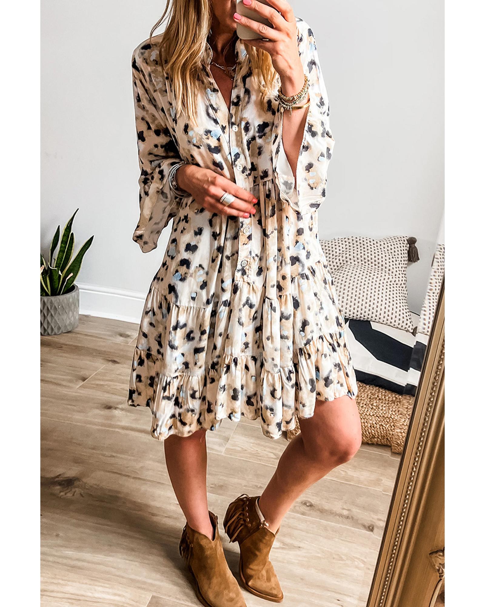Khaki Leopard Print Buttoned Front 3/4 Sleeve Tiered Ruffled Hem Dress – L