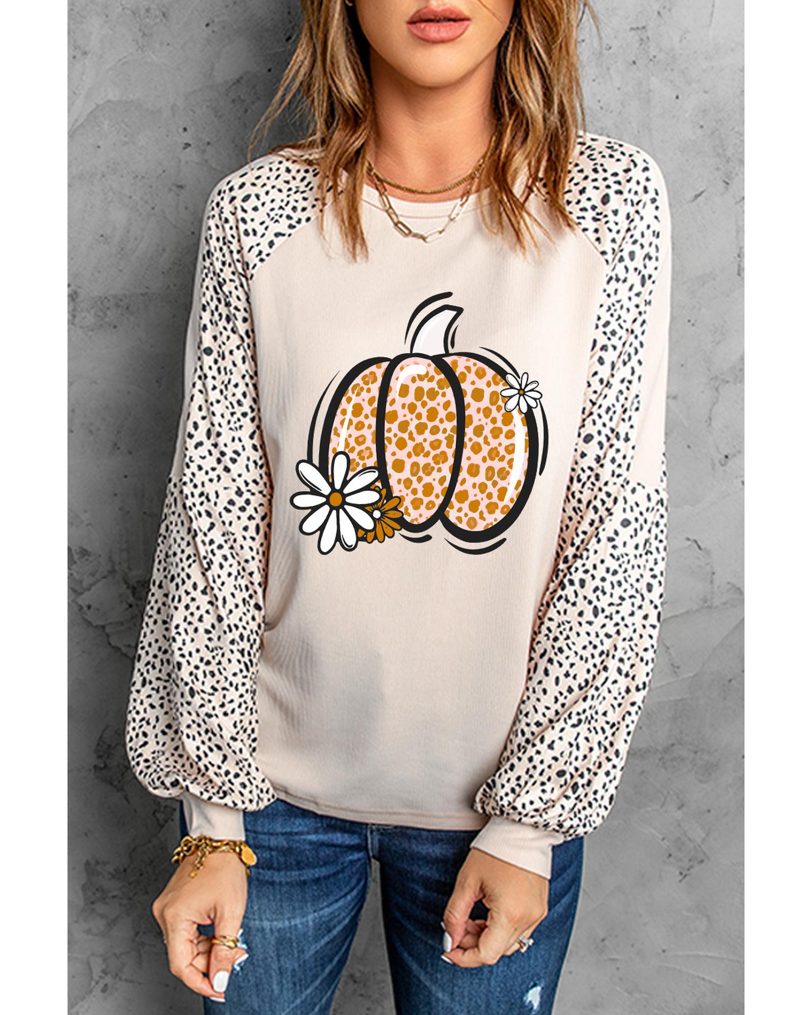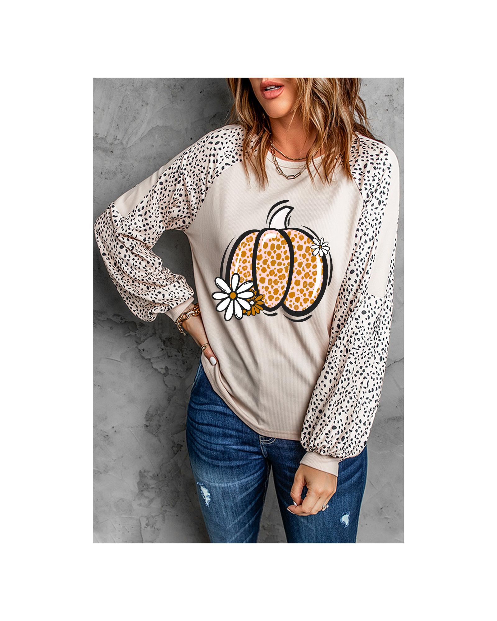 Khaki Leopard Raglan Long Sleeve Floral Pumpkin Graphic Top – L