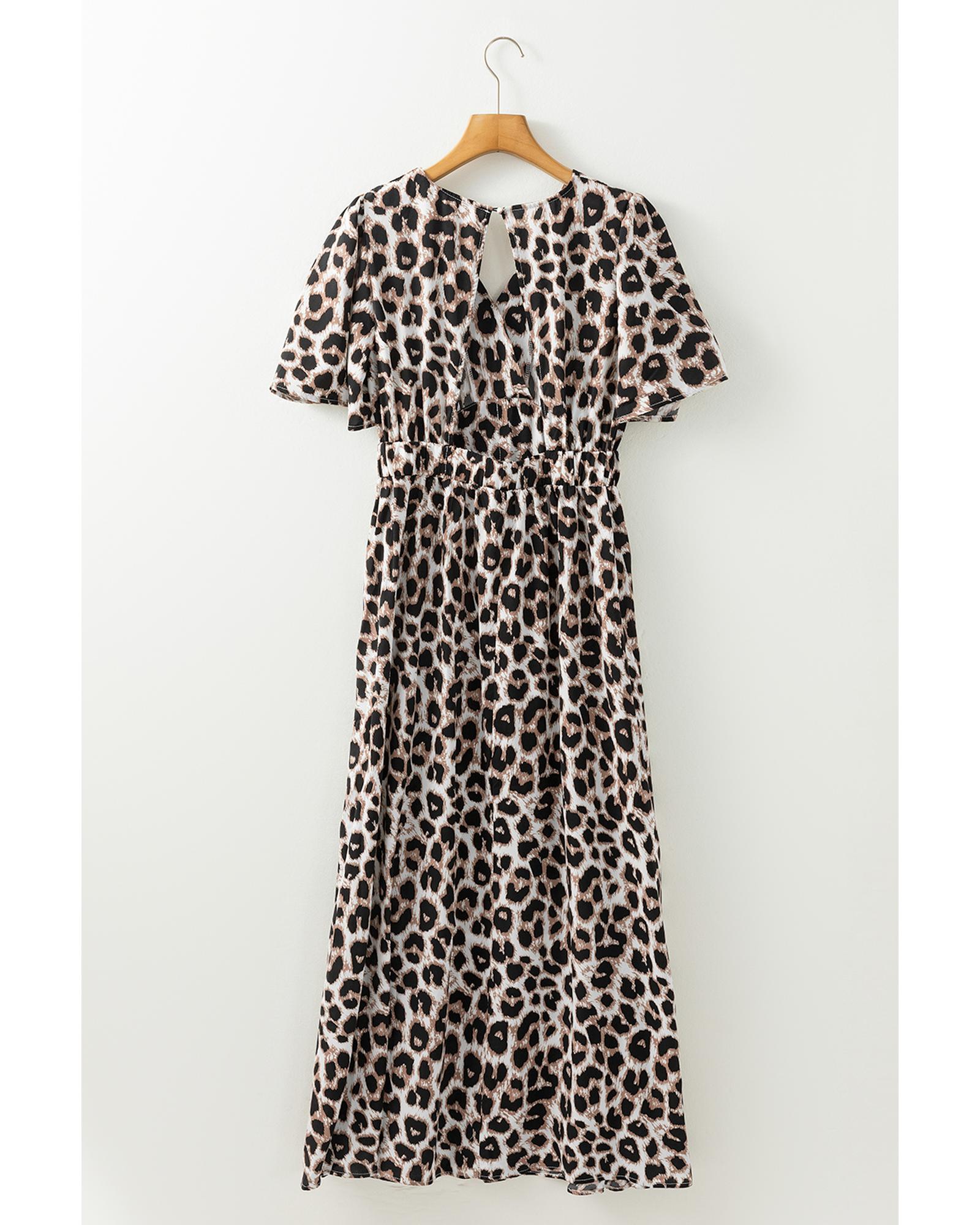 - Khaki Leopard V Neck Cinched High Waist Open Back Maxi Dress