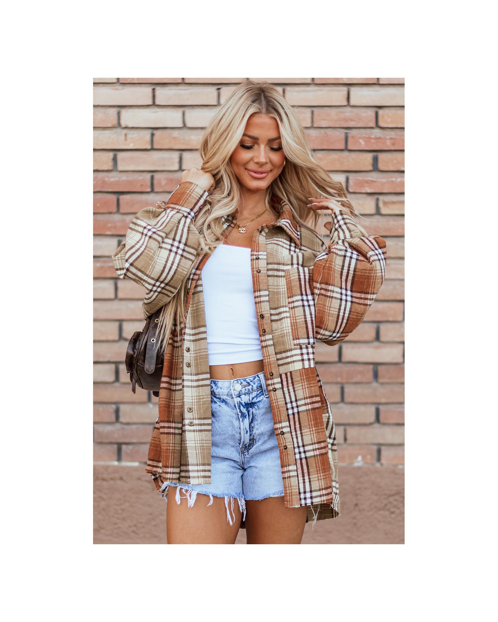 Khaki Plaid Colorblock Patchwork High Low Shacket – L