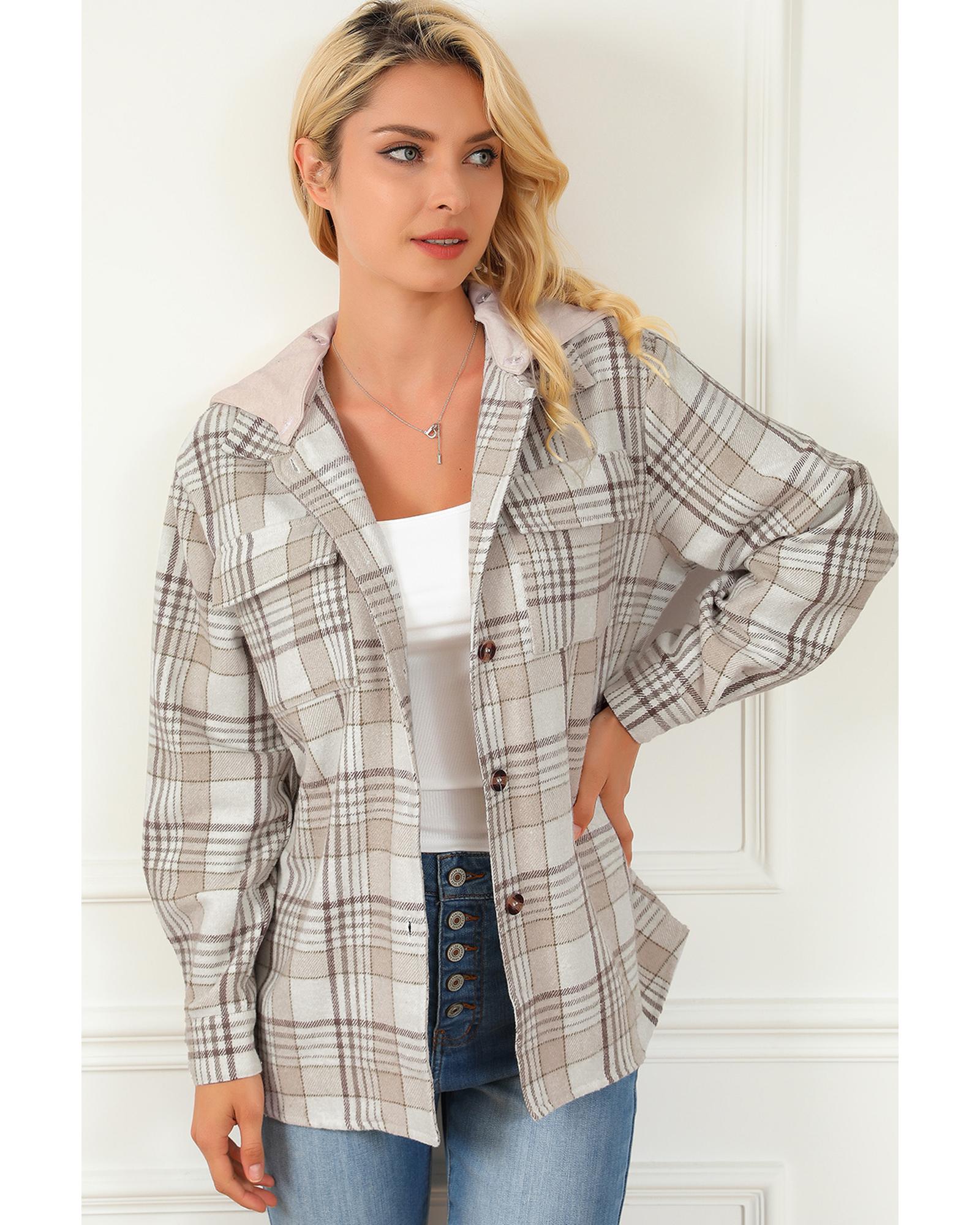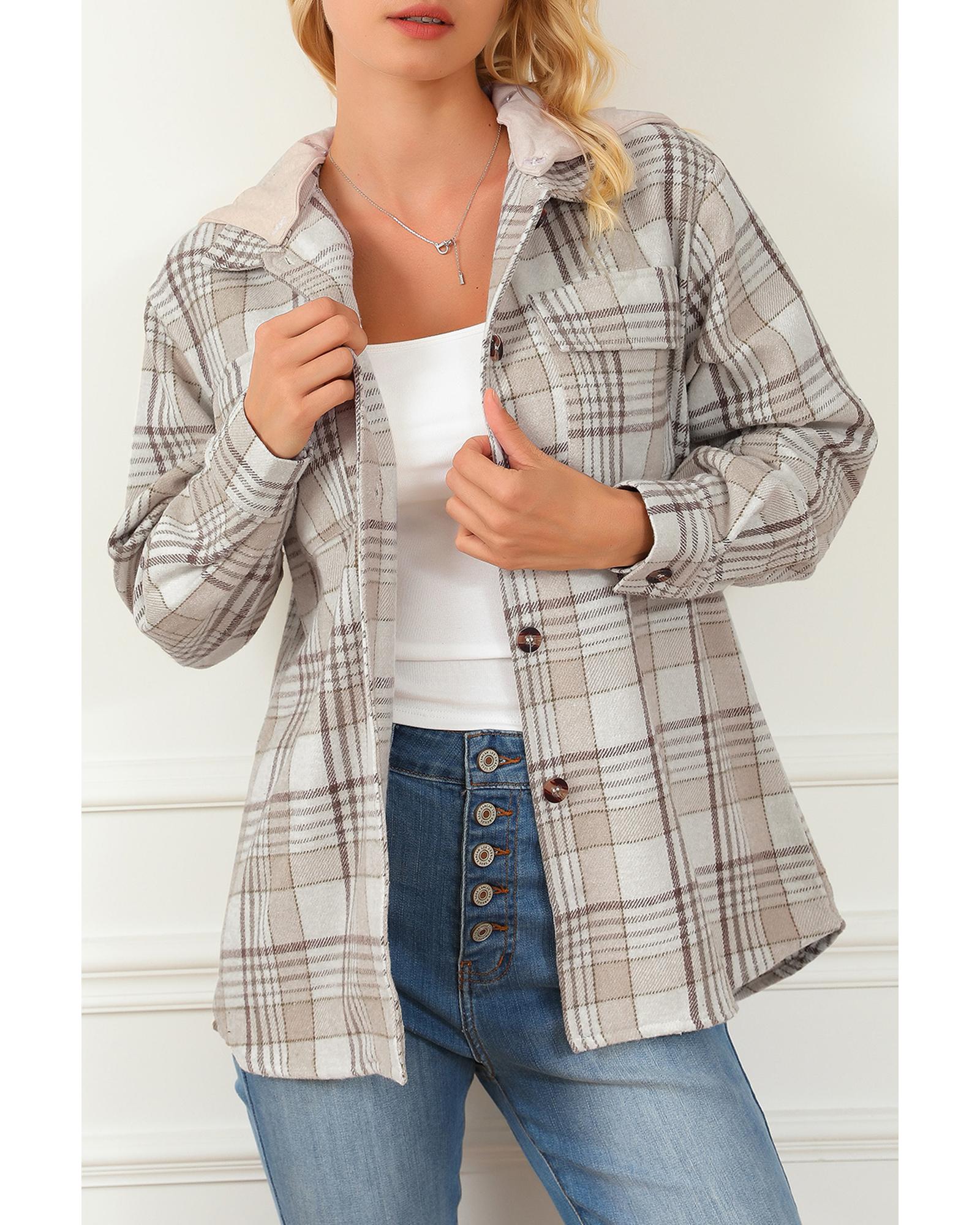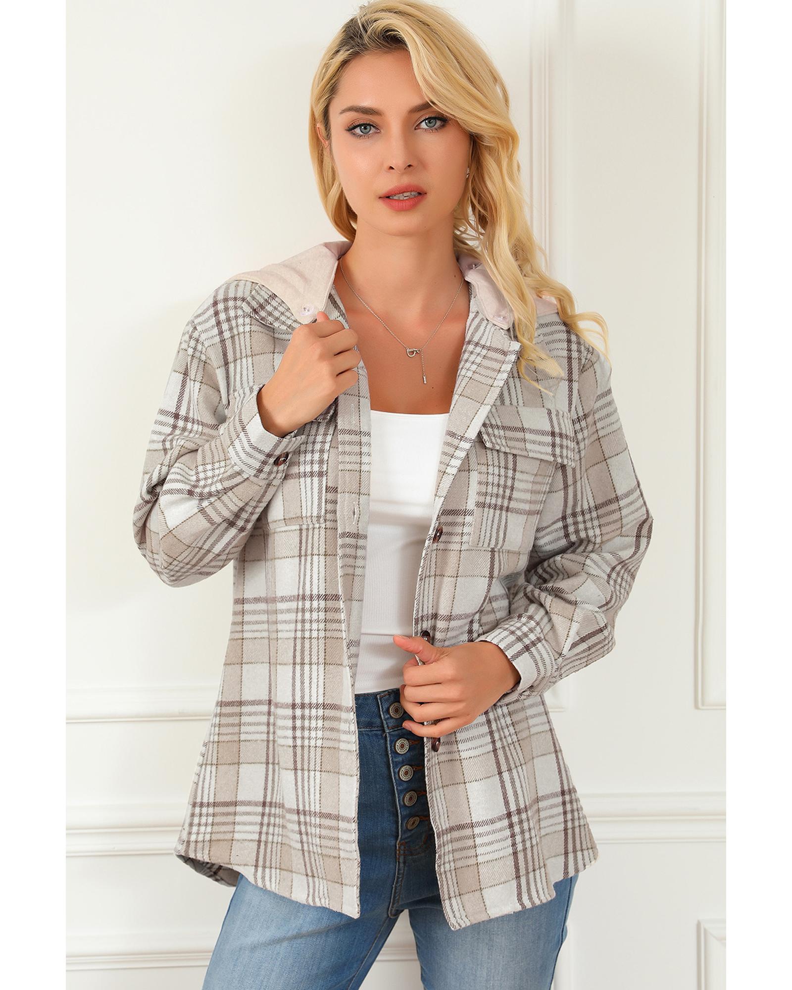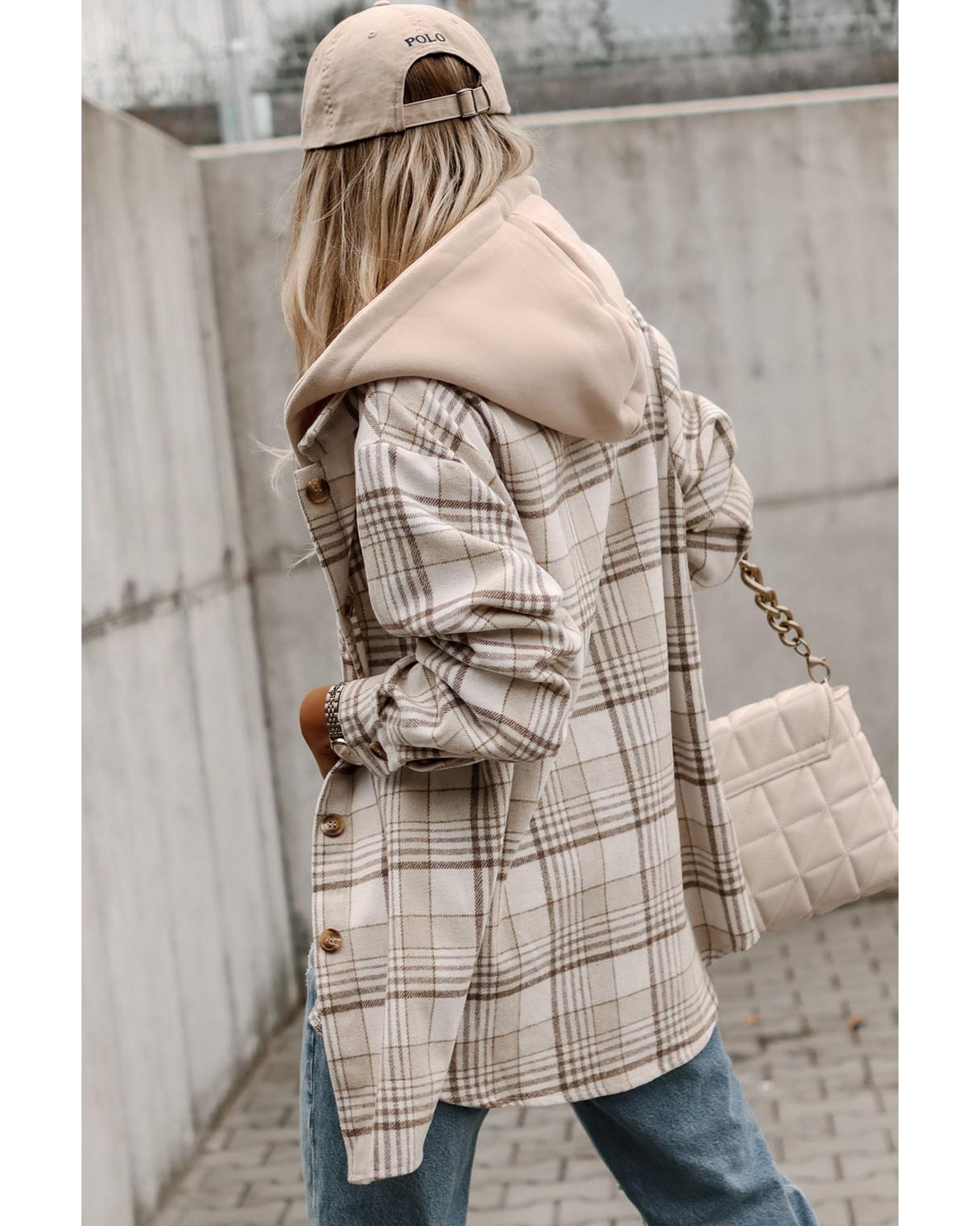 Khaki Plaid Removable Hood Buttoned Shacket – 2XL
