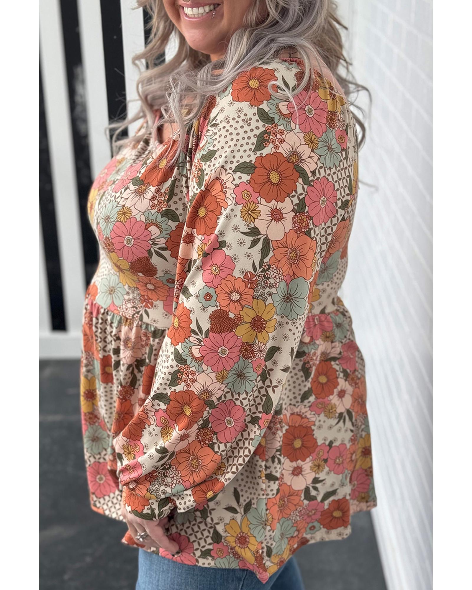 - Khaki Plus Size Flower Print Square Neck Peplum Blouse
