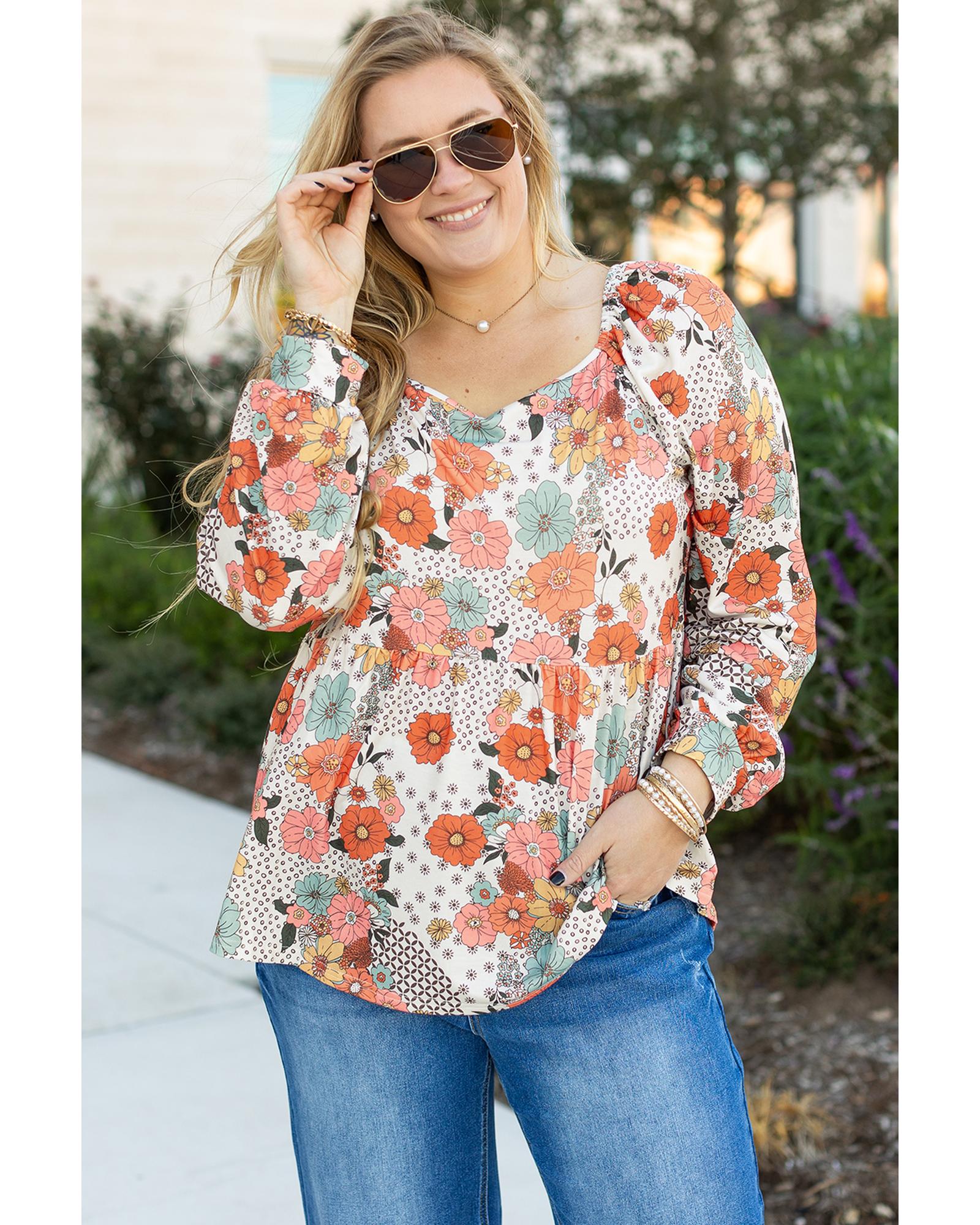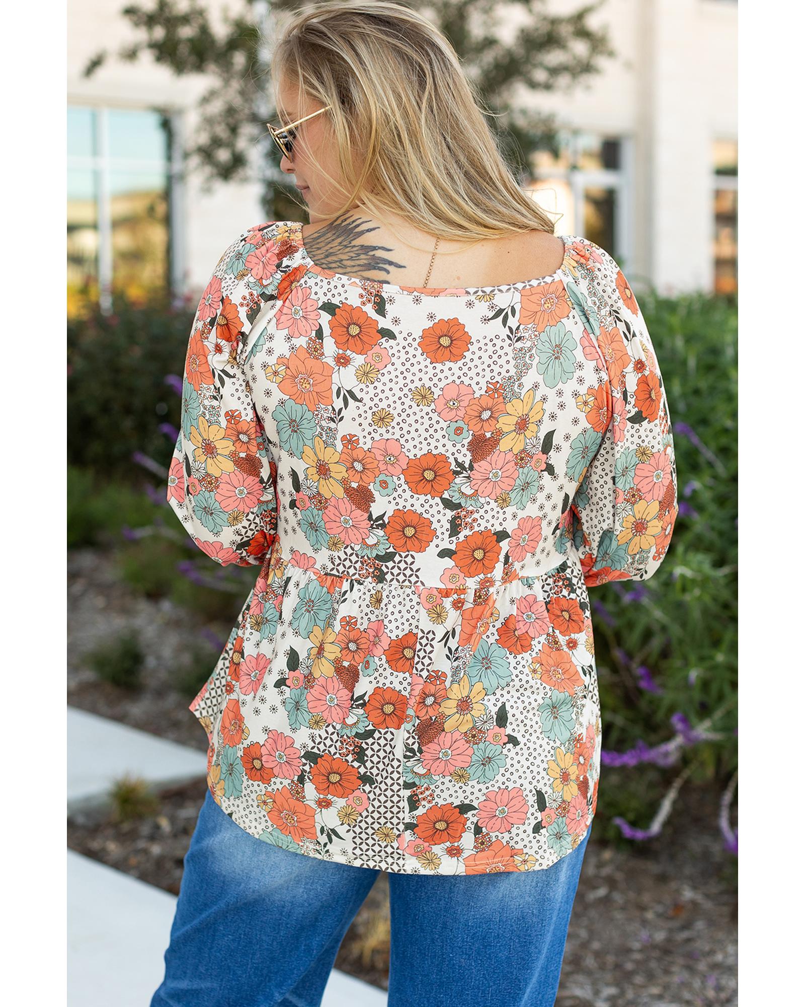 - Khaki Plus Size Flower Print Square Neck Peplum Blouse