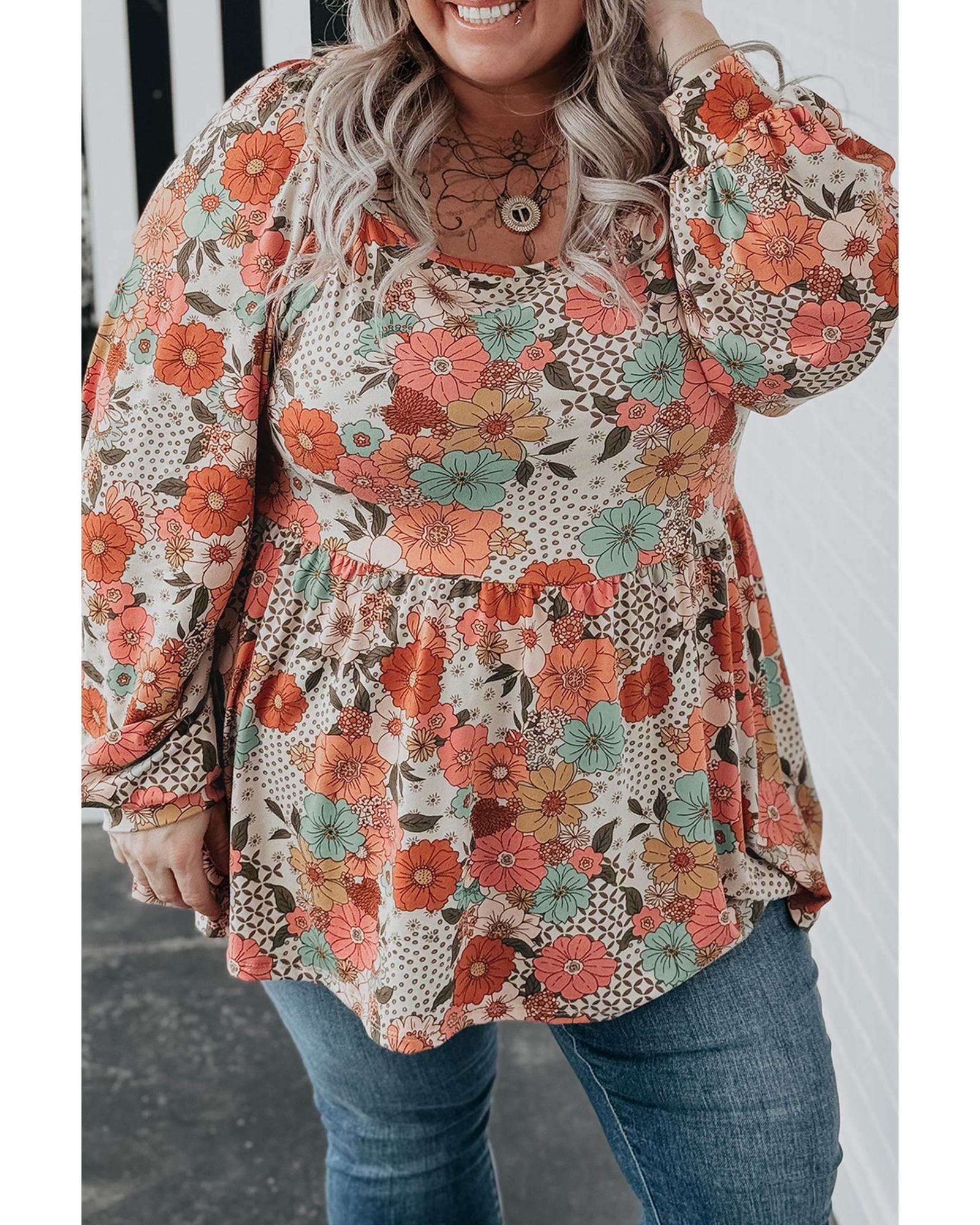 - Khaki Plus Size Flower Print Square Neck Peplum Blouse
