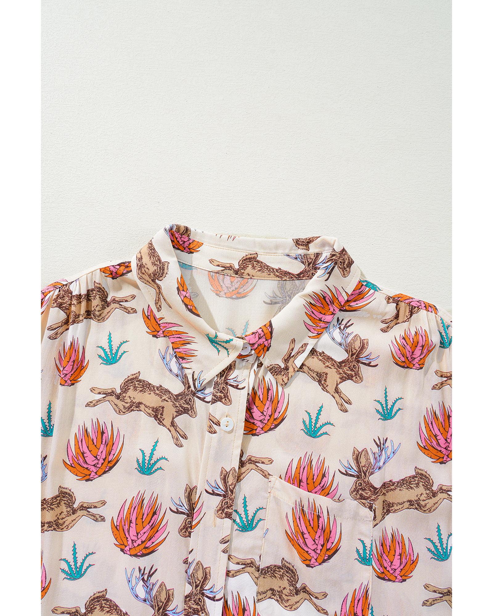 Khaki Plus Size Western Pattern Print Buttoned Short Sleeve Shirt – 4X